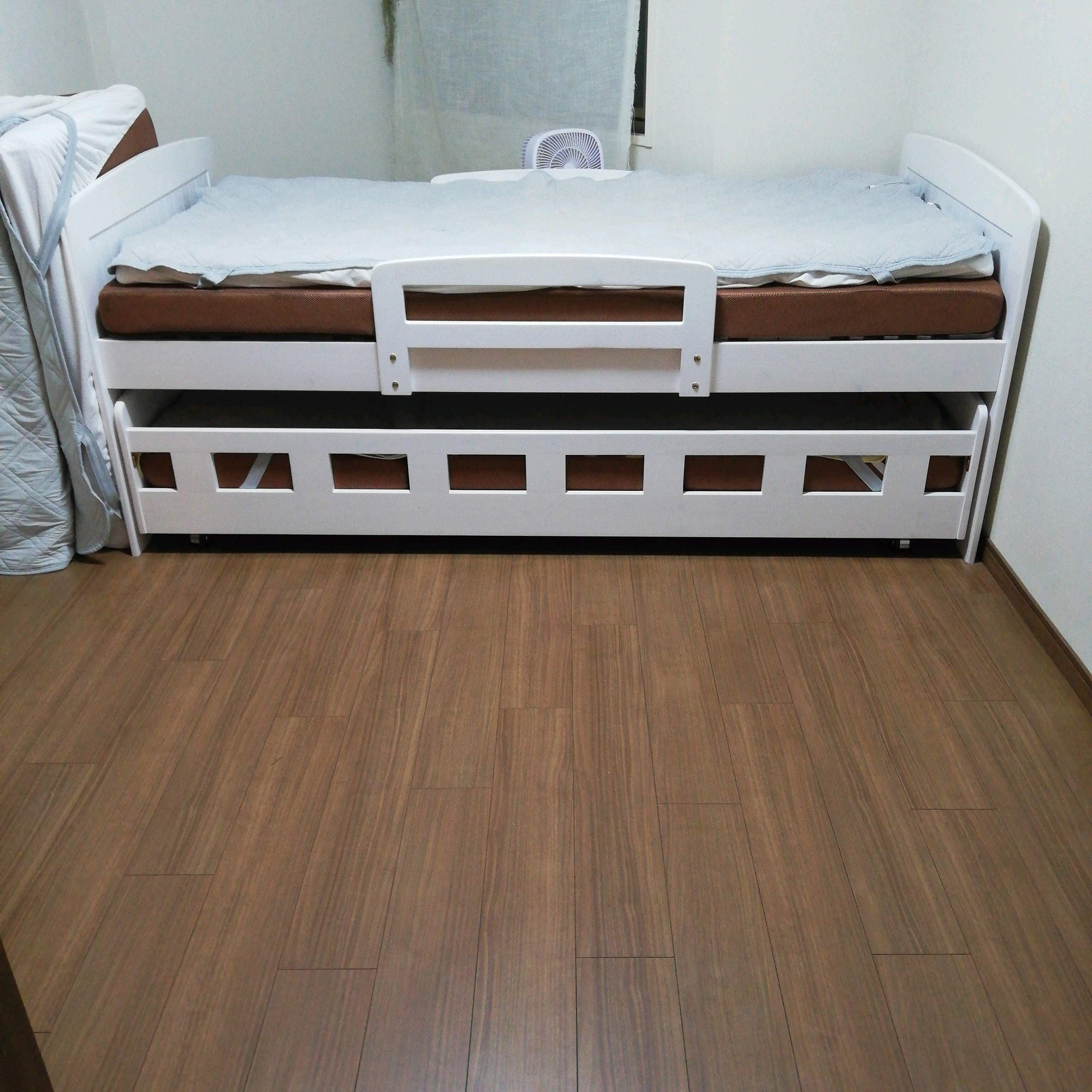 キャスターつきなので、使うときも楽々と引き出すことができます。このシングル親子ベッド+シングルの三つ折りマットレスに親子4人で寝ています。