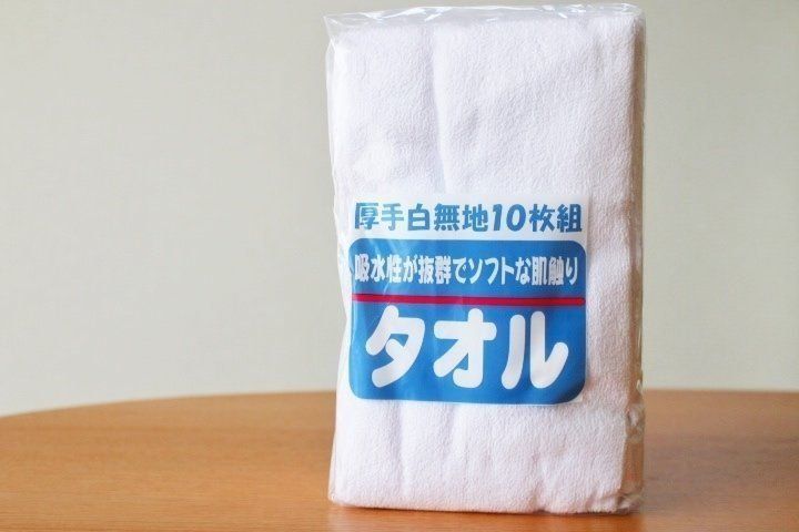 白無地のシンプルなタオル。サイズはフェイスタオルサイズです。10枚入りで767円(税込)。1枚あたり約77円と、100均より安いんです!昨年から使い始めリピート中。