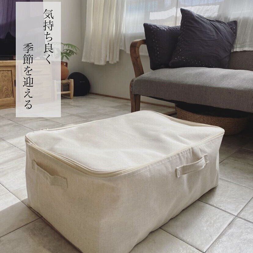 先ほど紹介した「ポリエステル綿麻混 ソフトボックスシリーズ」には、さらに便利なフタつきの衣装ケース(1,690円)も販売されています。フタがあるため、大切な洋服や小物をほこりから守ってくれて◎。持ち手がついているので、高いところに置いても取り出しやすいのも便利。シーズンオフの洋服を畳んで収納しておくのもよさそうです。