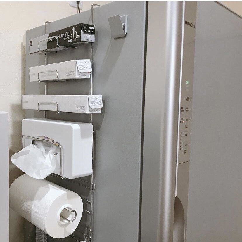 料理中にサッと取り出したいサランラップやキッチンペーパー。どこに収納していますか。ニトリの「冷蔵庫脇ラック」(1,047円)は、デッドスペースの冷蔵庫脇が収納スペースになってしまう便利なアイテム。取りつけは吸盤で貼り付けるだけと簡単。上3段にはラップやアルミホイル、下2段にはティッシュやキッチンペーパーを収納可能。出しっぱなしで収納できるので、料理中でもすぐに手が届いて便利そうです。