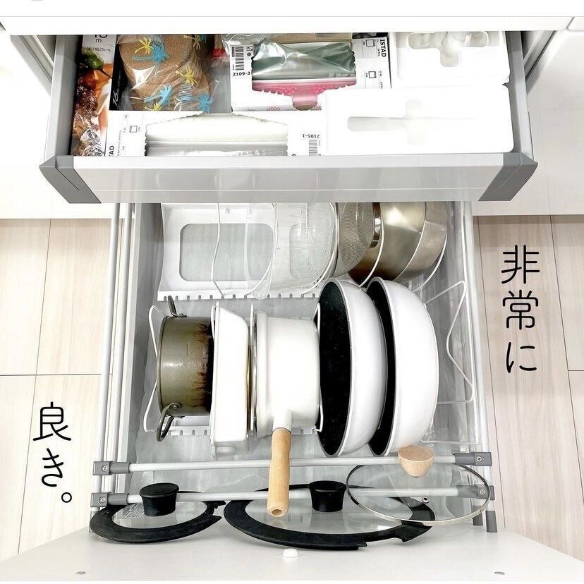 キッチンにはフライパンや鍋、ボウル…と使用するキッチンツールがたくさん。かさばるものも多いため、片づけたはずなのに気がつくと散らかっている…なんてことも。そんなかたにオススメしたいのが、ニトリの「ざる・ボウル フライパンスタンド(幅46〜86cm)」(1,790円)です。フライパン、鍋、フタetcを立てて収納することができるためスッキリと収納ができ、出し入れがラク。重ねず収納することで、何がどこにあるのか一目瞭然ですね。シンプルなデザインも◎。