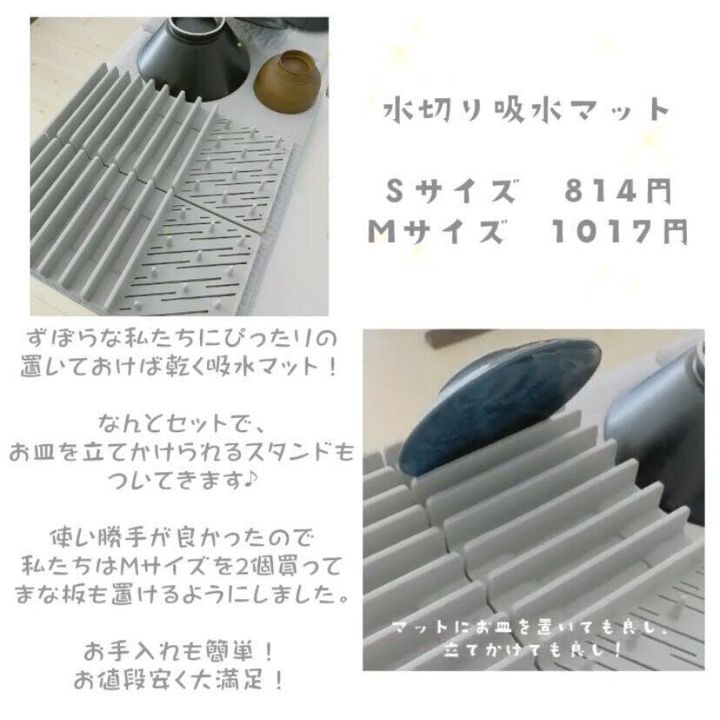 場所をとらず省スペースで使え、使い終わったらコンパクトに収納できる!と人気なのが、「水切り吸水マット」。お皿を立てかけられるプレートスタンドと吸水マットがセットになって、Sサイズは814円、Mサイズは1,017円とプチプラのアイテムです。プレートスタンド手前には、コップを立てかけられる突起つき。使い勝手もよくデザイン性も高いので、愛用者が多い理由にも納得です。調理スペースが狭いかた、有効に使いたいかたに便利なアイテムです。