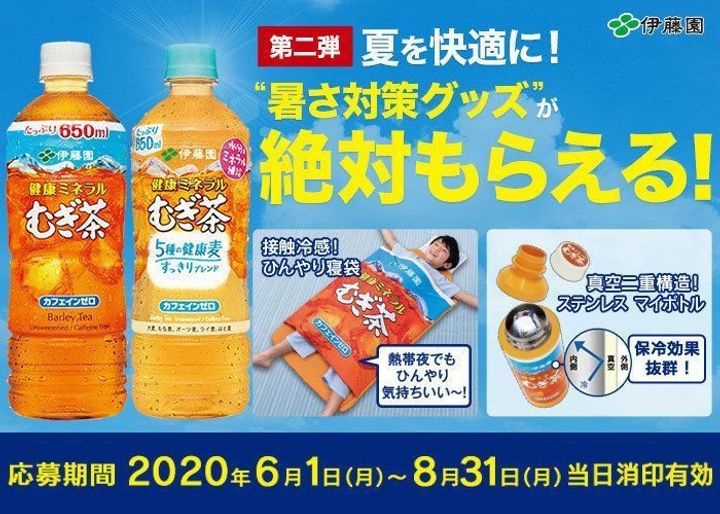 「健康ミネラルむぎ茶」の応募マークを集めて応募すると上記の“暑さ対策グッズ”が絶対もらえるキャンペーンを実施! 8月31日(月)当日消印有効なので、「健康ミネラルむぎ茶」と暑さ対策グッズで快適な夏を過ごしましょう♪