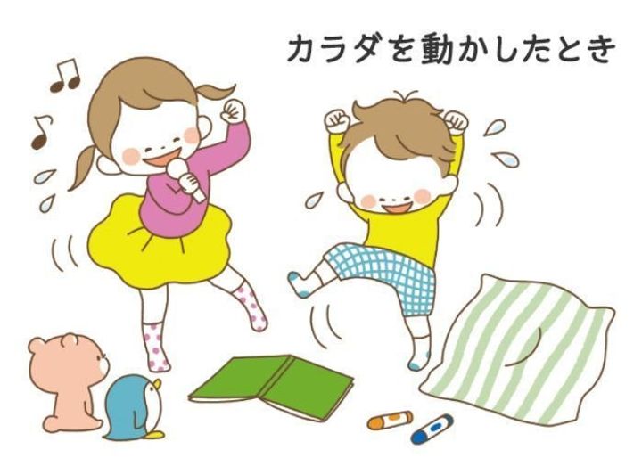 室内で過ごす時間が多いときは家族みんなでできるエクササイズを踊ってみるなど、少し汗ばむ程度の運動をしてみてはいかがでしょう。カラダを動かすことは気分転換にもなりますし、暑熱順化対策にもなるので一石二鳥。お子さんが運動や遊びに夢中になって汗をかいたときは、ママやパパたちがしっかり水分、ミネラル補給をするようにサポートしてあげましょう。