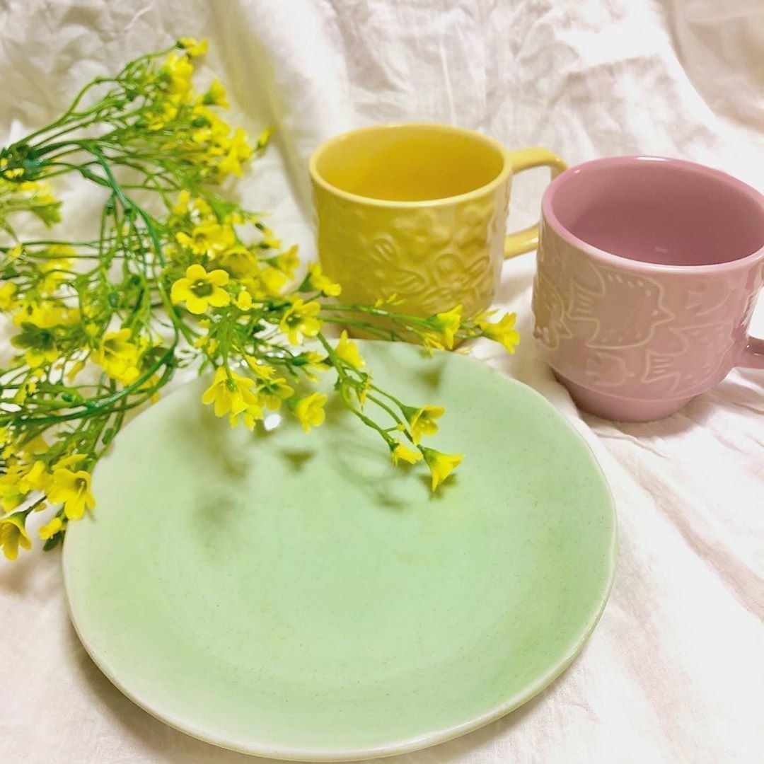 北欧風なデザインのマグカップとシンプルなお皿。テーブルが映えそうなおしゃれさですね。マグカップはスタッキングできるため、収納するときもスペースを取りません。