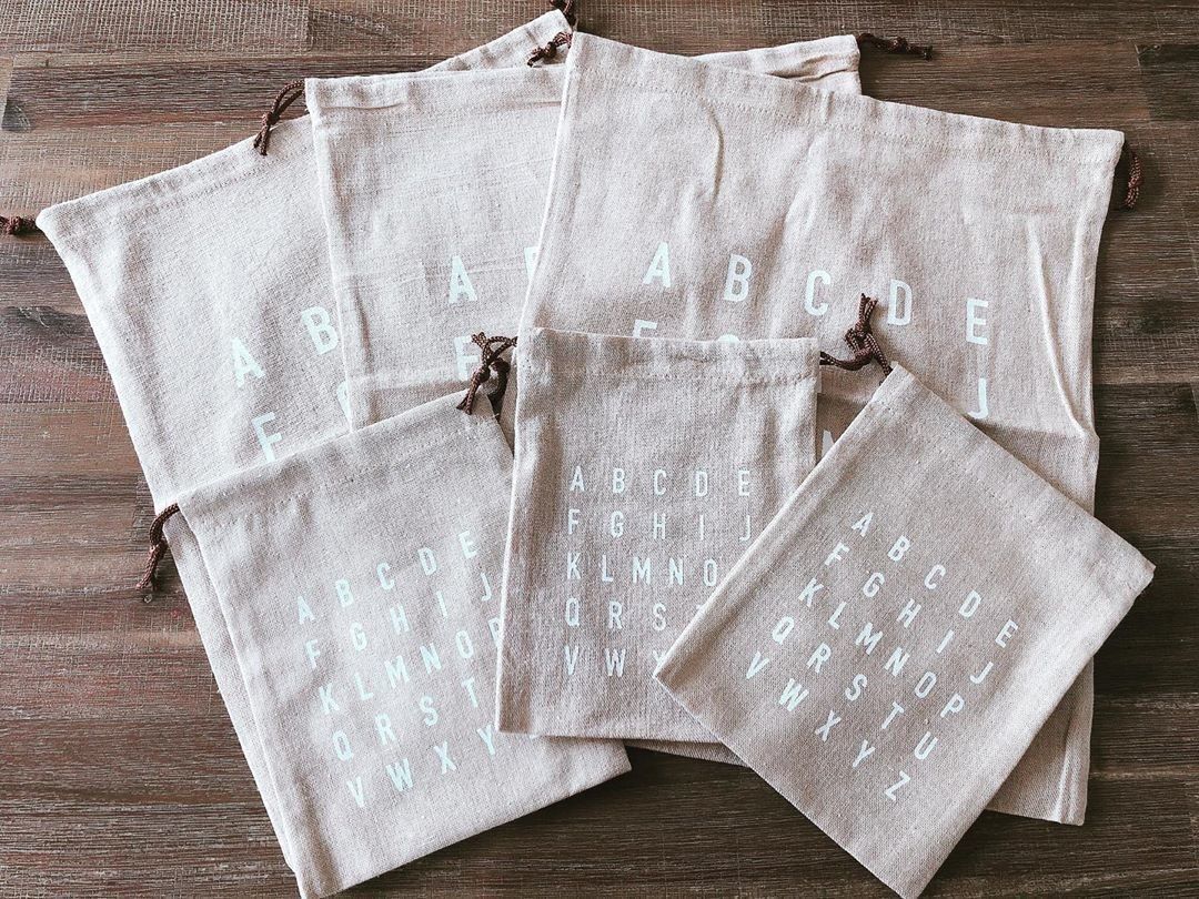 アルファベットが描かれたシンプルだけれど、おしゃれなデザインが魅力の巾着。S、M、Lサイズが展開されているため用途にあったサイズが選べます。