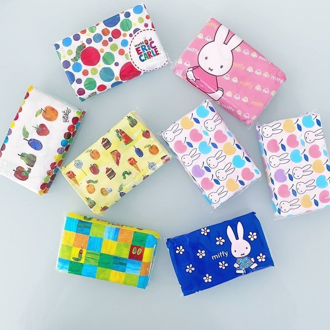 人気キャラクターたちが描かれたポケットティッシュ。ポーチに入れておきたくなるかわいらしいデザインです。水に流せるという点も使いやすいポイントではないでしょうか。
