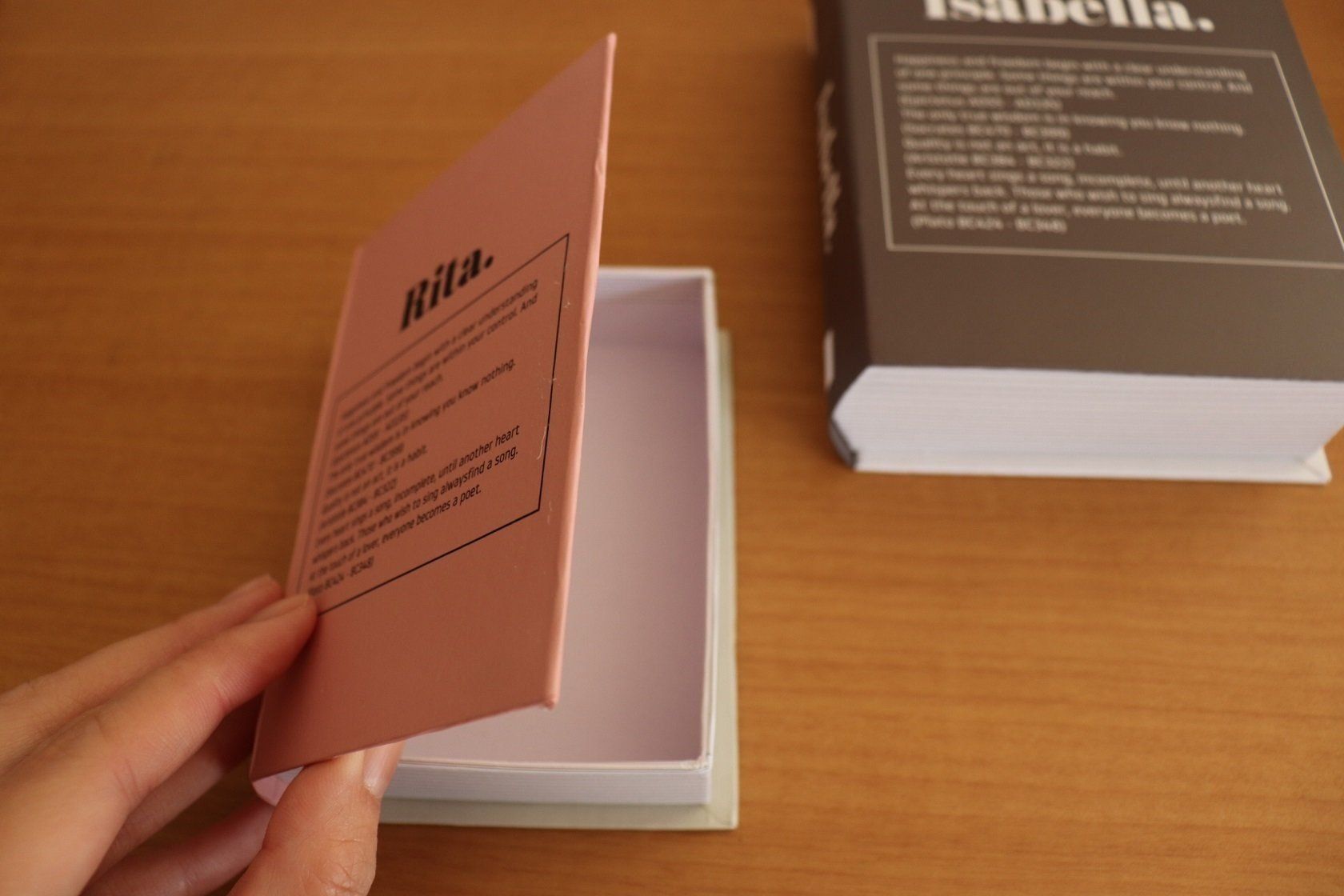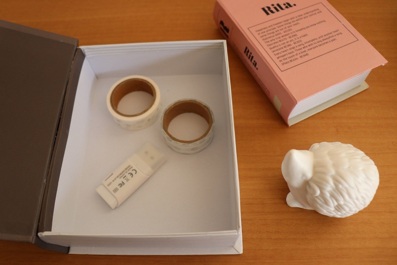このおしゃれな本の正体はブック型の小物入れ!物を入れた後、立てて収納できるところが魅力的。セリアで見つけたものは色もくすみカラーでインテリアに馴染みやすく、小物入れとしてだけでなく、置いておくだけでインテリアの小物としても使えそう!