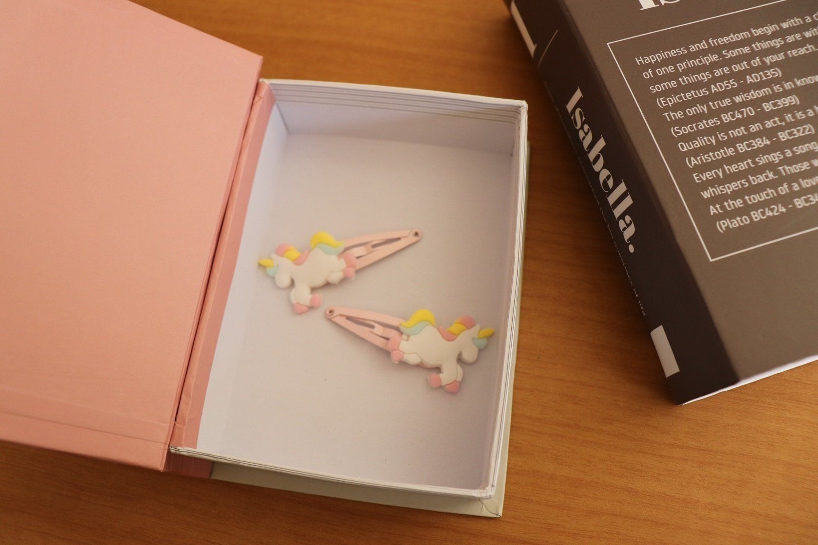 ピンクのボックスはサイズが8.5cm×12cm×3cm。お子さんのこまごましたピン留めや散らかりがちなカードを入れて子ども部屋にディスプレイしてあげてもGOOD!