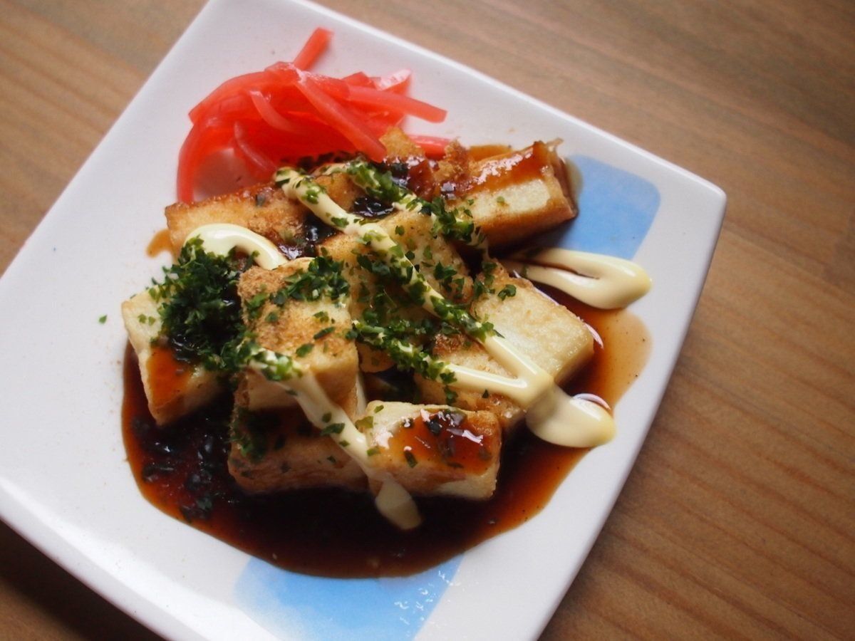 筆者がいただいたなかでも驚いたのは、厚揚げのたこ焼き風です。賽の目切りにした厚揚げをフライパンで炒めます。このとき、油を入れないのがポイントです。焦げ目が少しつくくらいで皿に移して、ソース、マヨネーズ、青のりをかけて、紅ショウガをのせます。焼き目がカリッとして、中がしっとりしていて、まさにたこ焼きという感じです。