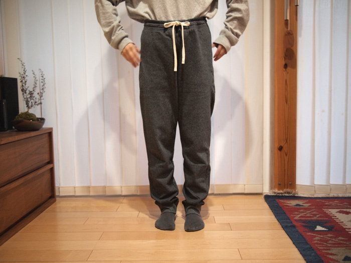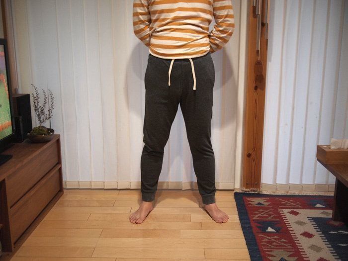 なぜかメンズしか商品展開がないので、夫もはけるようにとメンズのLを注文。150cmの筆者がはいてみると写真のような感じ。ゆったりしていてフィット感も申し分ない!長すぎるということもなく、腰の紐でウエストも調節できるので、今ではほぼ私がはいております…。