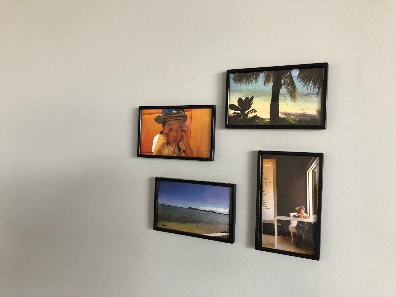 Mサイズのほうはほぼ名刺サイズと、そこそこに大きさがあります。それを活かして、コンパクトなフォトフレームにするという使い方もアリ。縦位置、横位置どちらでも使えるので、小さなスペースにたくさんの写真が飾れます。寂しい壁を、すてきにレイアウトできますね。