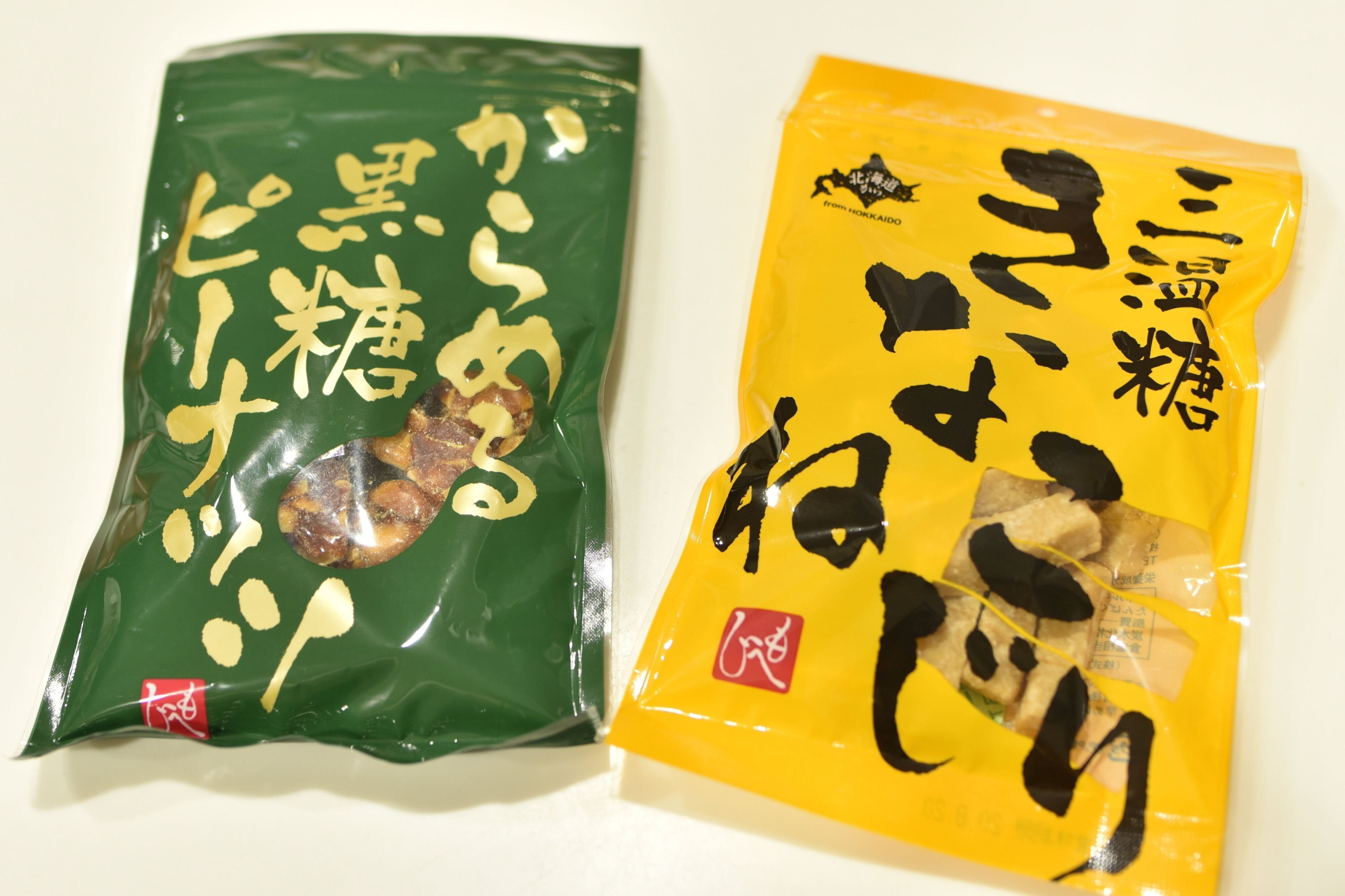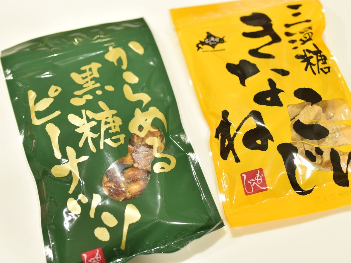 今回紹介させていただくのは、「三温糖きなこねじり」(195円)と「からめる黒糖ピーナッツ」(198円)です。