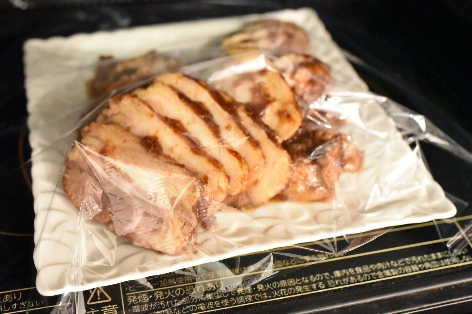 湯せんや電子レンジで温めるだけで食べられる煮豚で、私のおすすめの温め方は、電子レンジです。袋の中の煮豚は、(写真を撮った時は)3個入りでした。食べたい分量の煮豚をスライスしてから、電子レンジで温めます。