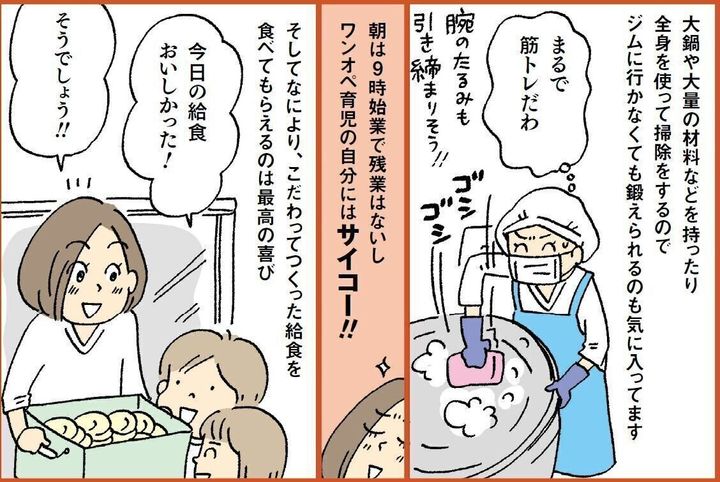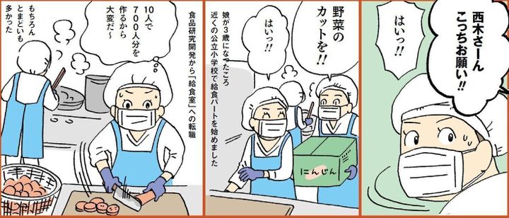 高等専門学校を卒業後、乳製品メーカーに就職。25歳で結婚。夫の就職で引っ越すことになり、妊娠6カ月で退職。26歳で長女を出産。29歳で給食パートをスタート。平日5日、9~15時で働く
