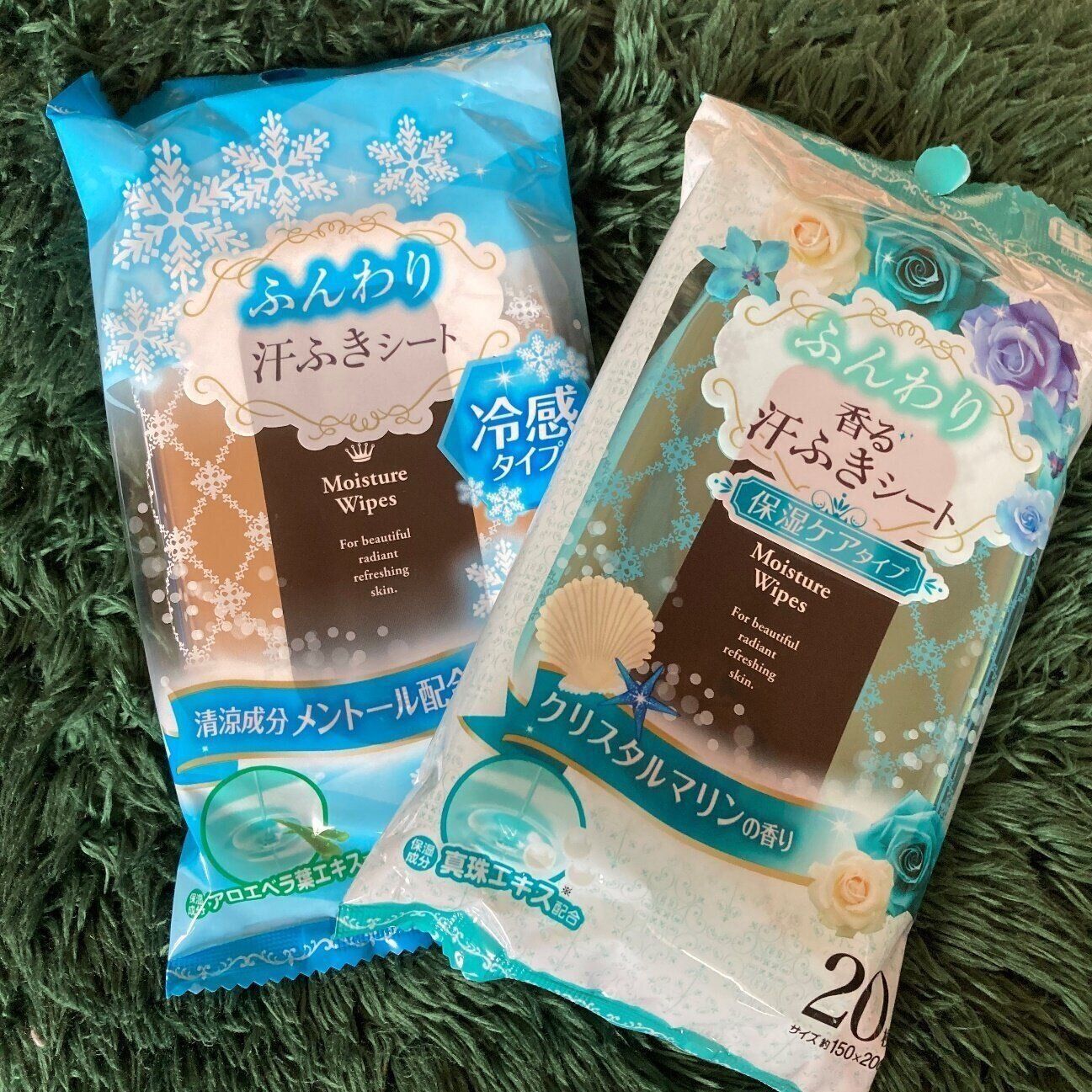 汗ふきシートには、汗をふくだけでなく、汗を抑える効果や、いい香りで気持ちを落ち着かせる成分が入っています。今回セリアで2種類の「汗ふきシート」を購入しました。「ふんわり汗ふきシート」の、冷感タイプと保湿ケアタイプ。
