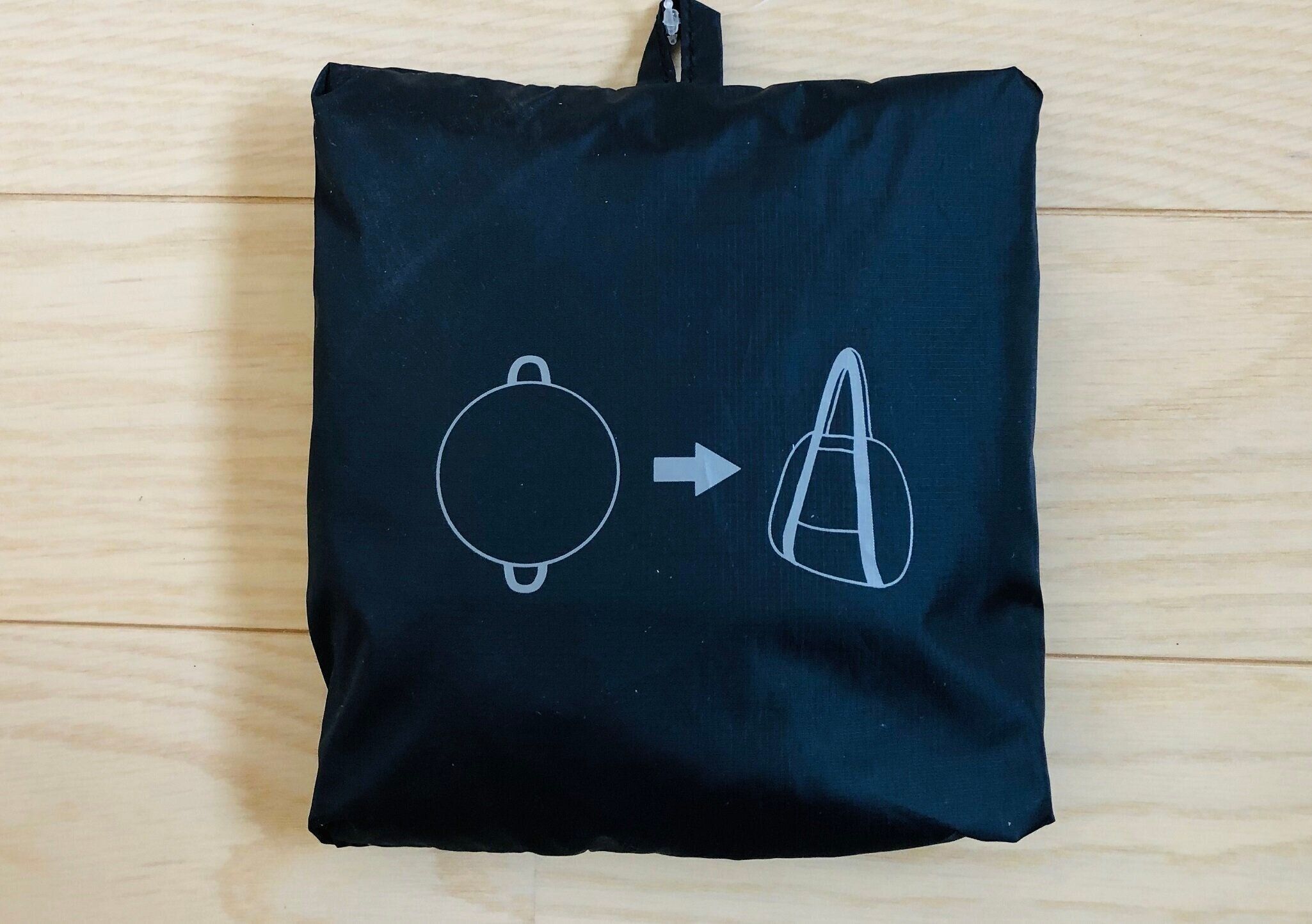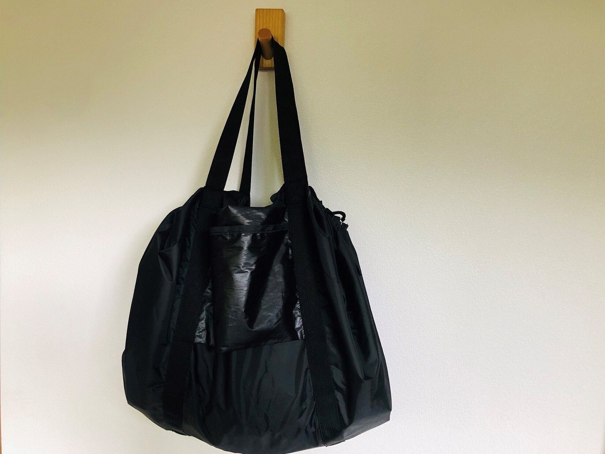 今回ご紹介するのは、無印良品の「絞るだけで包めるポケッタブルバッグ 黒」です。お値段1,490円(税込)でカラーは黒の1色展開ですが、この黒がどんな服にも合わせやすくシンプルでカッコイイ!