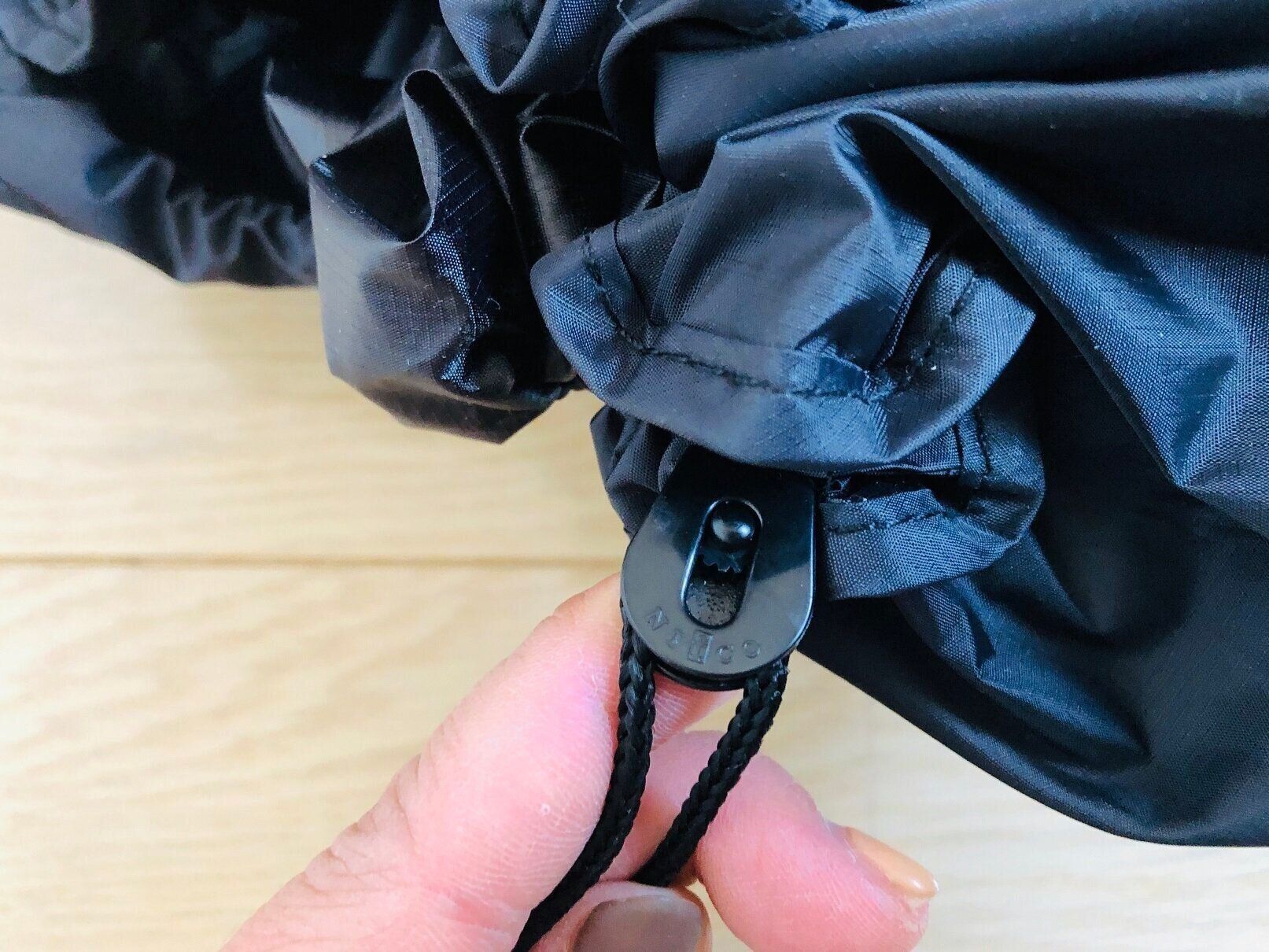 ひもを絞ったあとは、ロックをかけることができるので、うっかりバッグが開いて商品をバラまいてしまう……ということも避けられるはず。