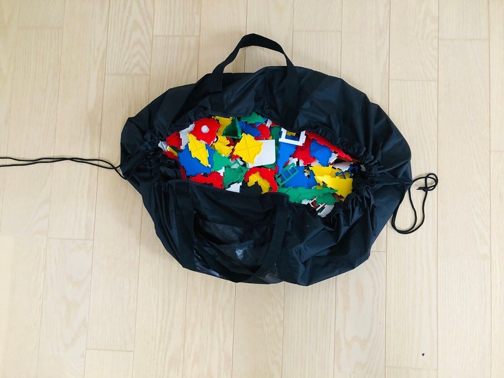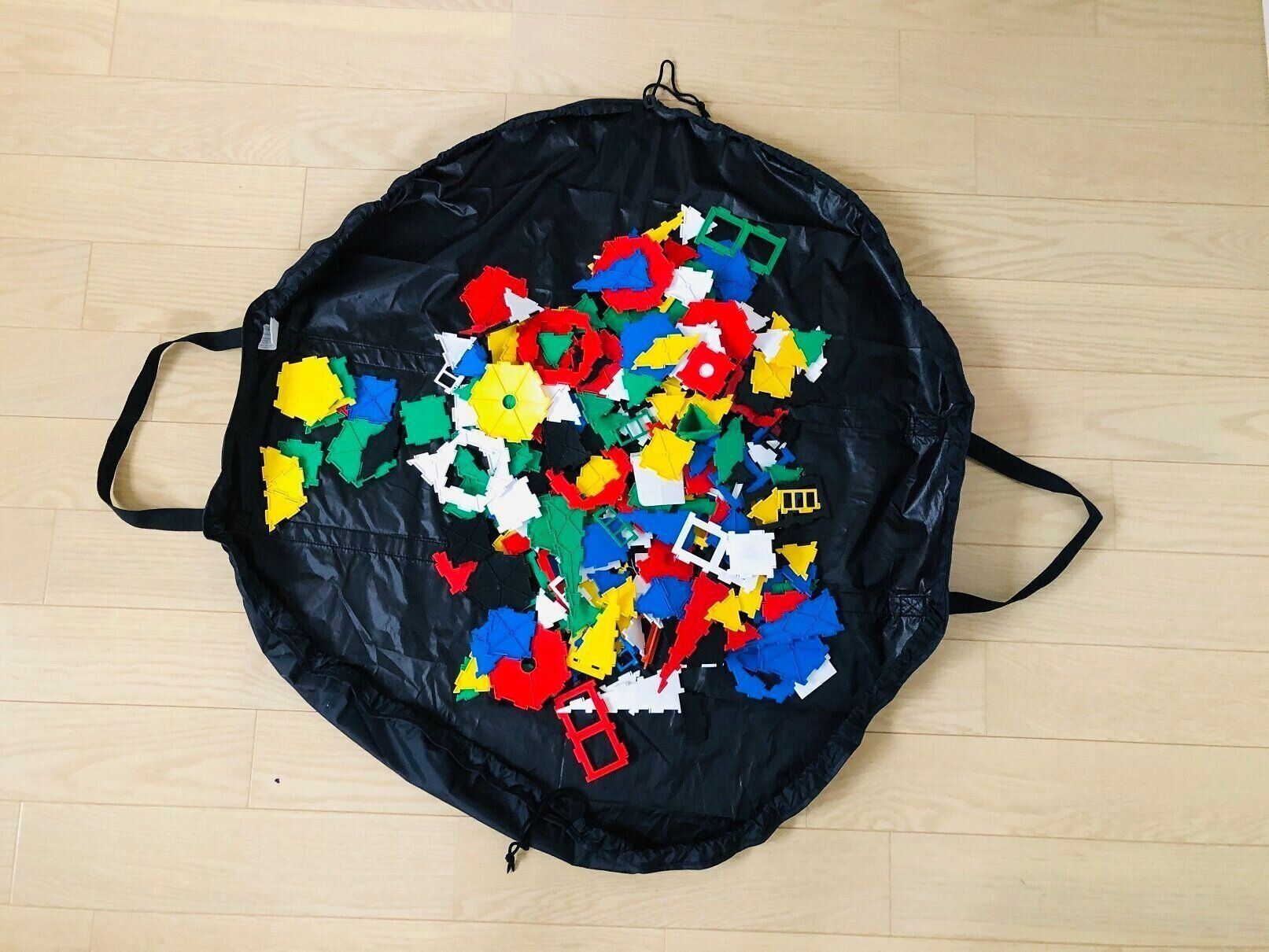 広げると1枚の布になるので、たとえば子どものブロック遊びスペースなどに活用するのもおすすめ。「このバッグの上で遊んで、終わったらしまってね!」と、ルールを決めれば、ブロックがあちこちに広がりませんし……。