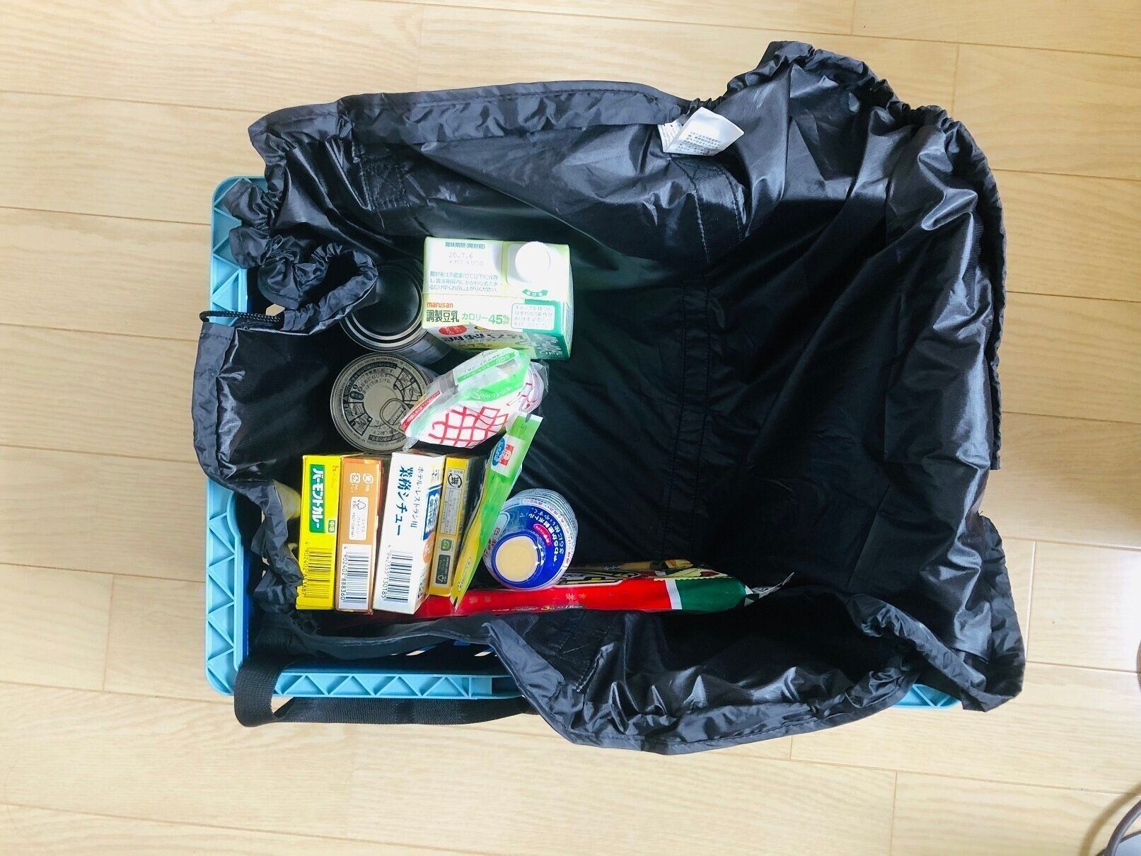 マイバッグとして使うときには、写真のように買い物かごにバッグをかけた状態で商品を入れて、最後は両サイドのひもを絞ればOK!子どもでも使いやすいですね。