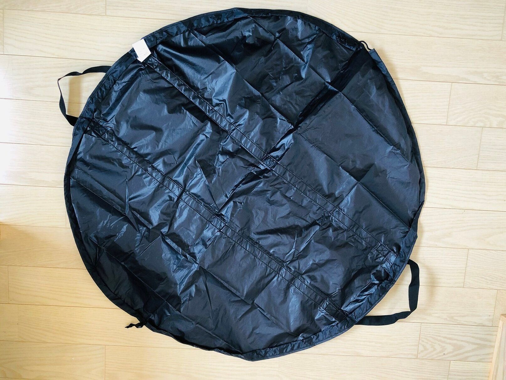 広げると直径90cmの丸いポリエステルの布ですが、ひもを引くと巾着袋のように口が狭まるようになっています。