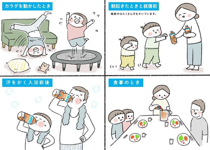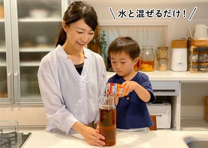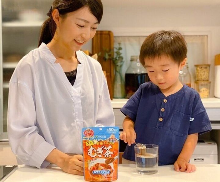毎日の朝起きたときや食事中、遊んで汗をかいたとき、入浴前後、寝る前などに飲用したいのが、無糖でカロリーゼロ、カフェインゼロのミネラル入りむぎ茶。水分だけでなくミネラルも補給できるから、冷蔵庫にいつでもストックしておくのがおすすめです。