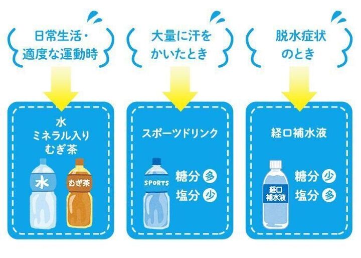 大量に汗をかいたときや激しいスポーツをしたときはスポーツドリンク、脱水症状のときには医師の指示のもと経口補水液にするなど、生活シーンや体調に合わせて選びましょう。