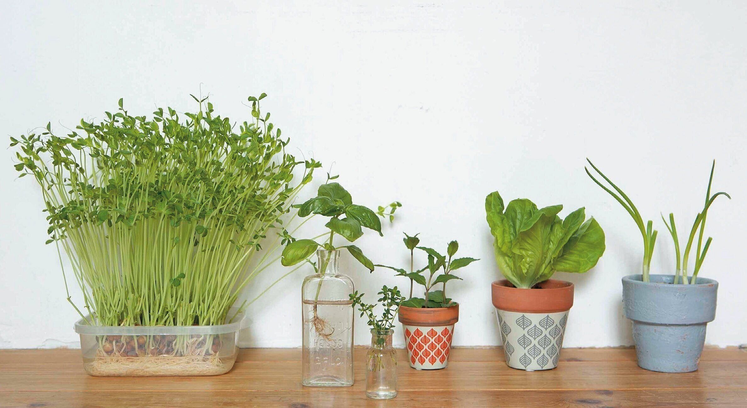 土と水で育てる〈ねぎ類、サラダ菜、ミント、タイム、バジル〉