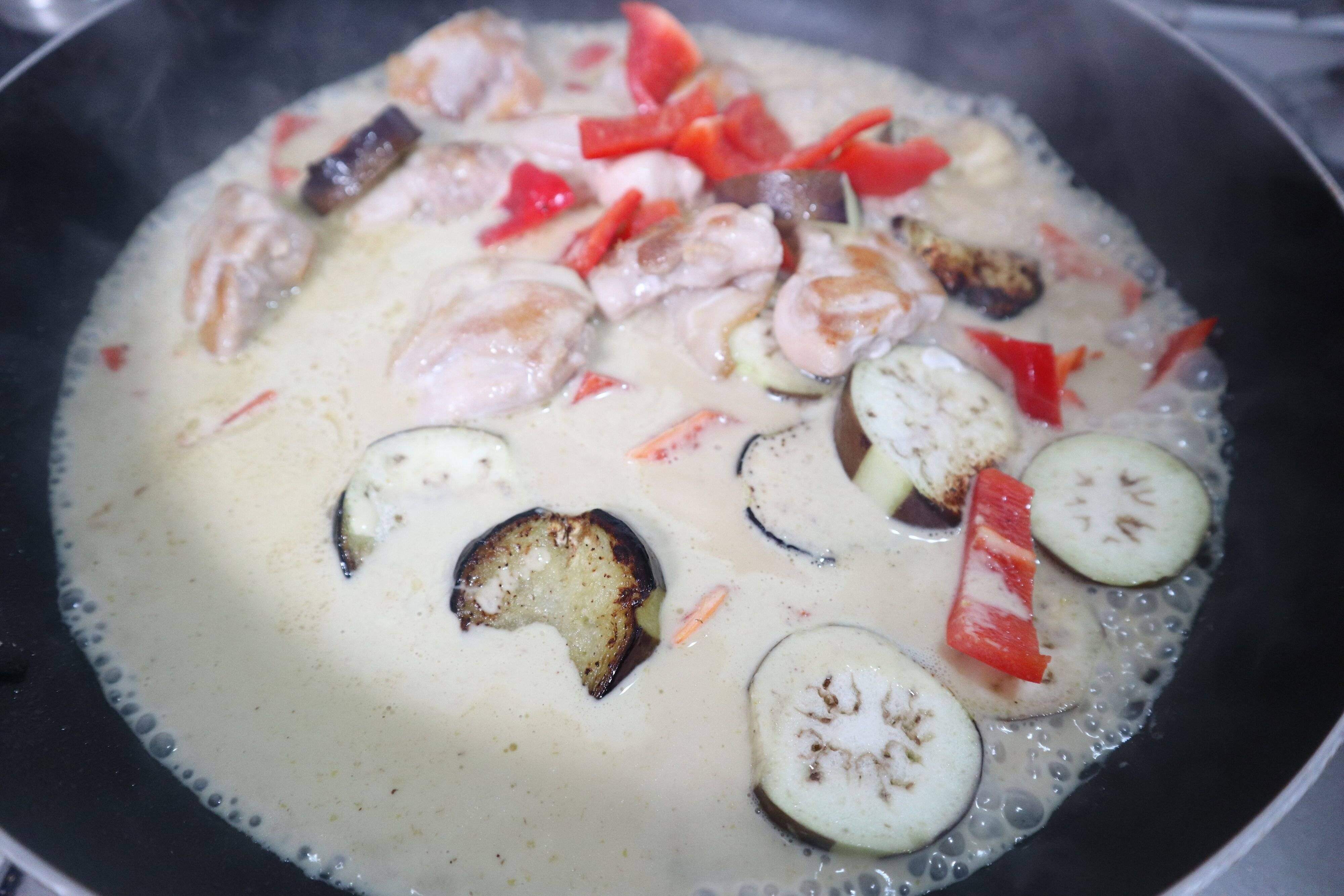 2.ナスに火が通ったら、パプリカとグリーンカレーを加えて5分煮たら完成です。