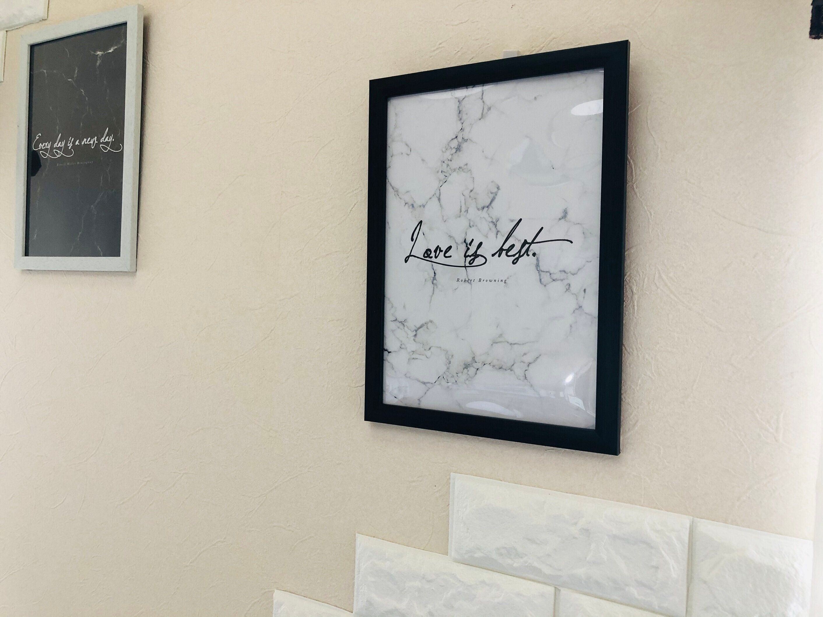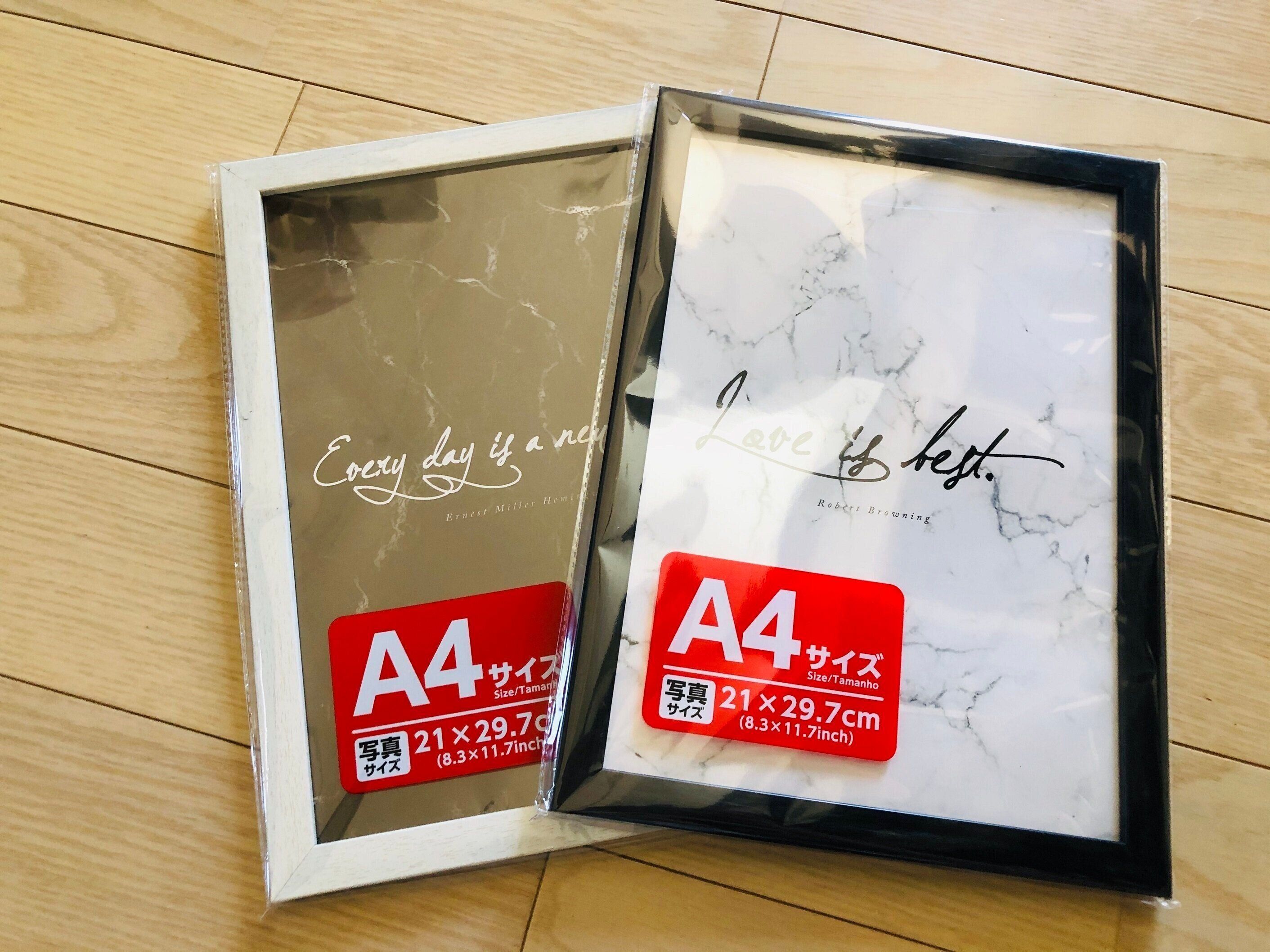 この写真フレームのいいところは、写真からもわかるとおり、あらかじめフレーム内に大理石調の印刷物が貼られているところ。額を購入しても中に何をいれたらいいか迷う……という方におすすめ!