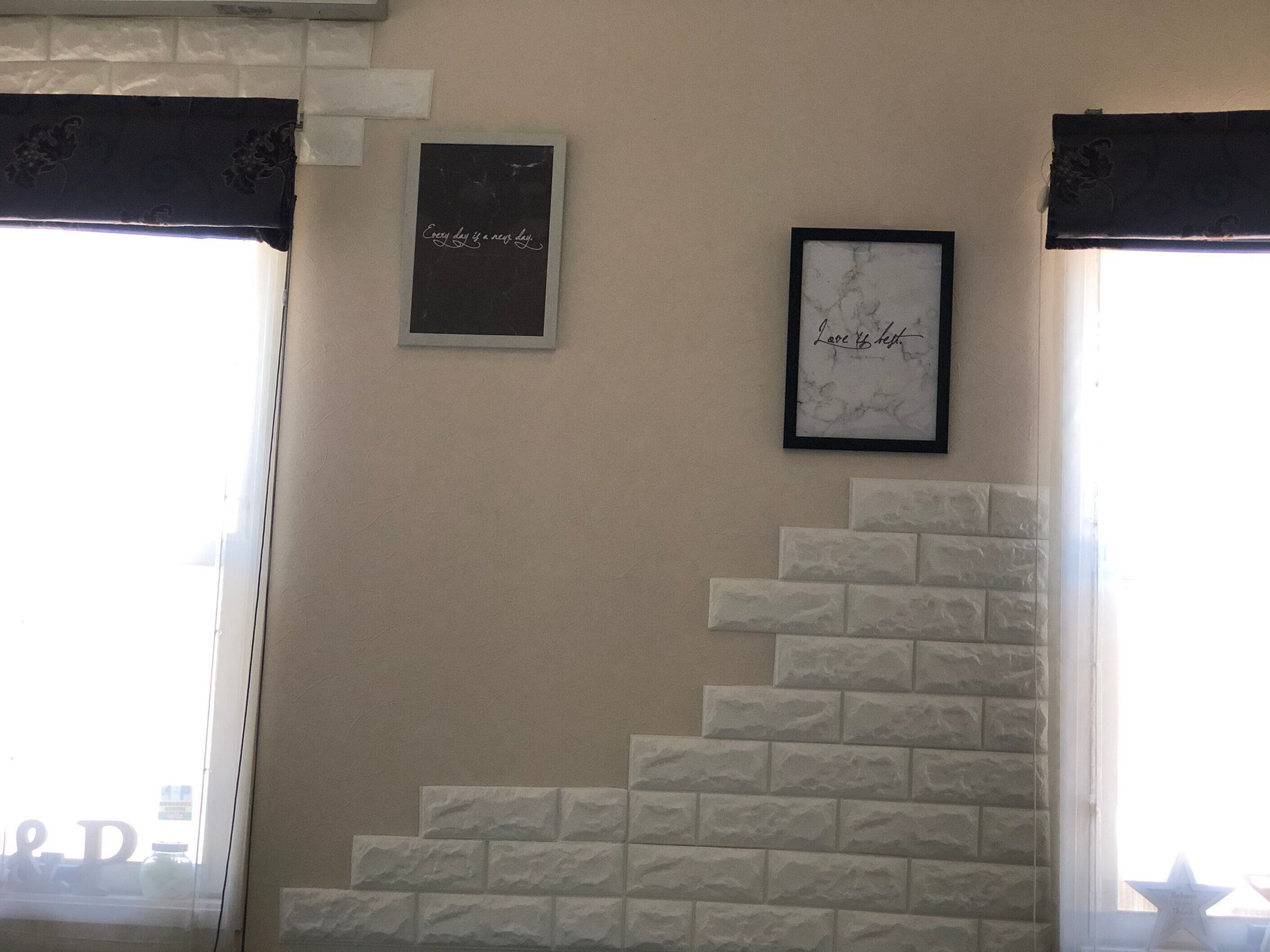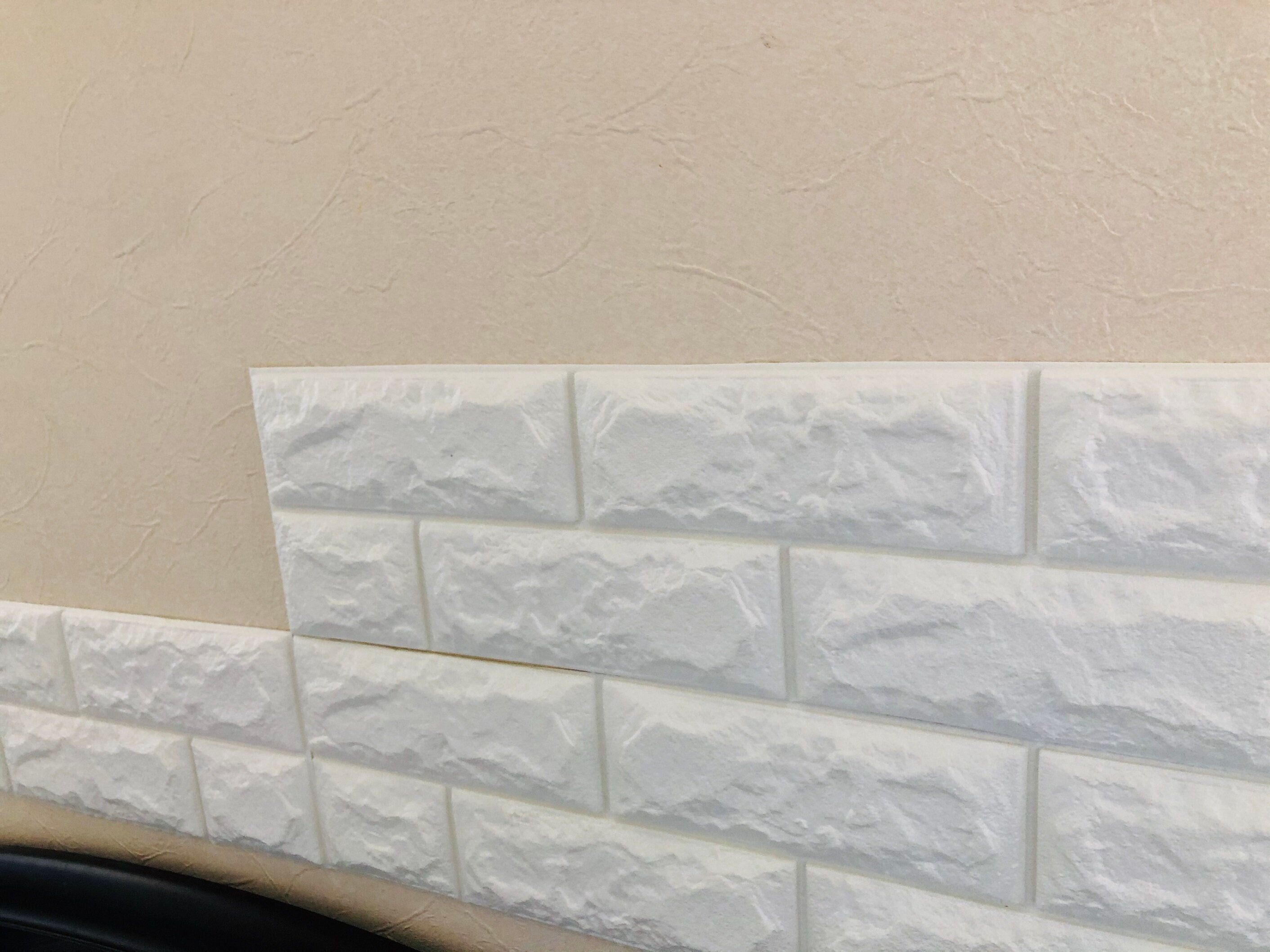 写真のように、階段状にレンガを積みあげたように張っていけば、壁全面に貼らなくても雰囲気が出ます。もちろん、少し奮発して壁全面にシートを張ってしまえば、部屋の雰囲気もガラっと変わるでしょう。