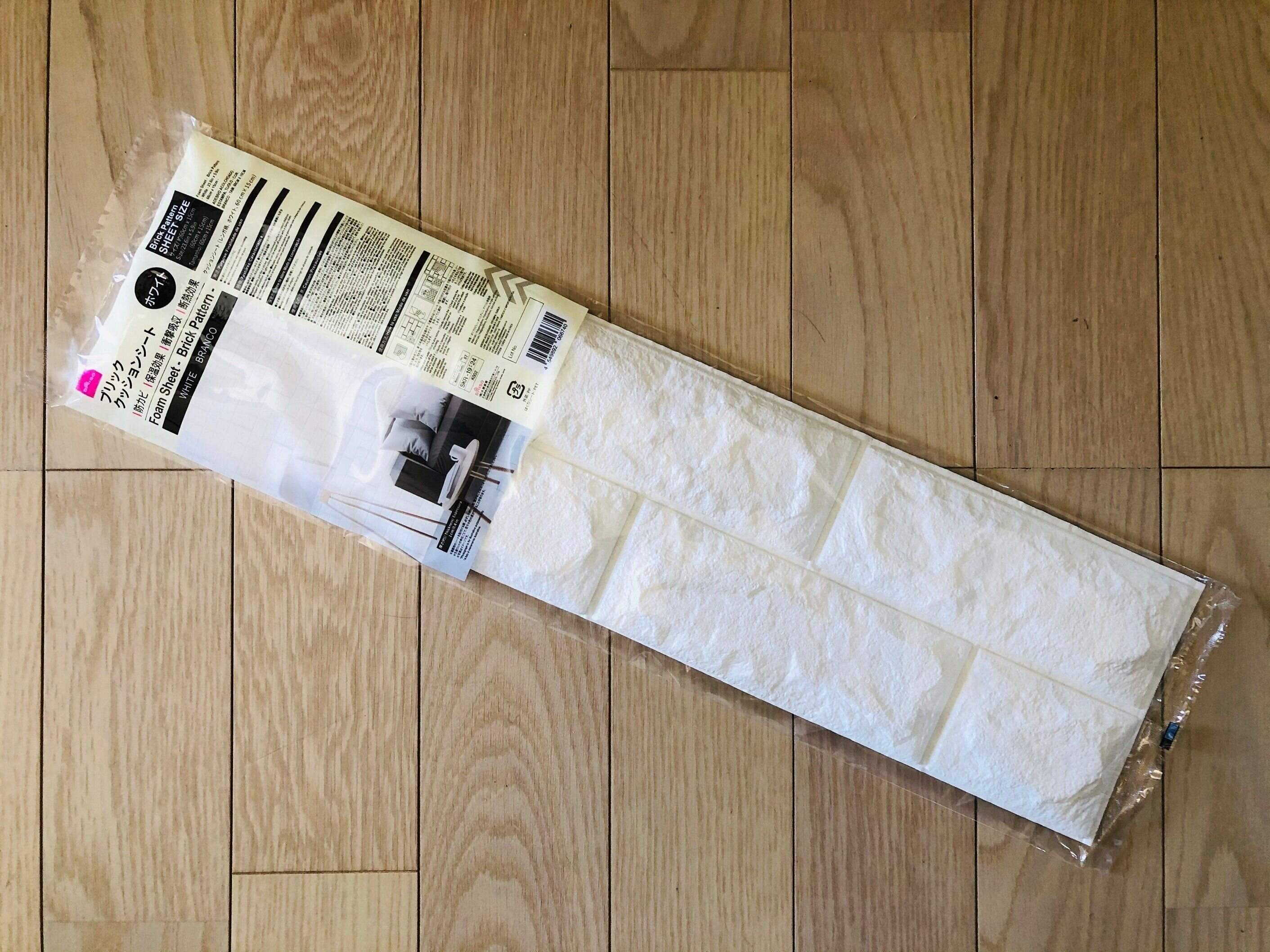 まず使うのは、こちらのダイソーの「ブリッククッションシート」。表面に白いレンガのようなデザインが施されたシートで、サイズは1枚あたり約60cm×15cm。ハサミで簡単にカットすることができます。
