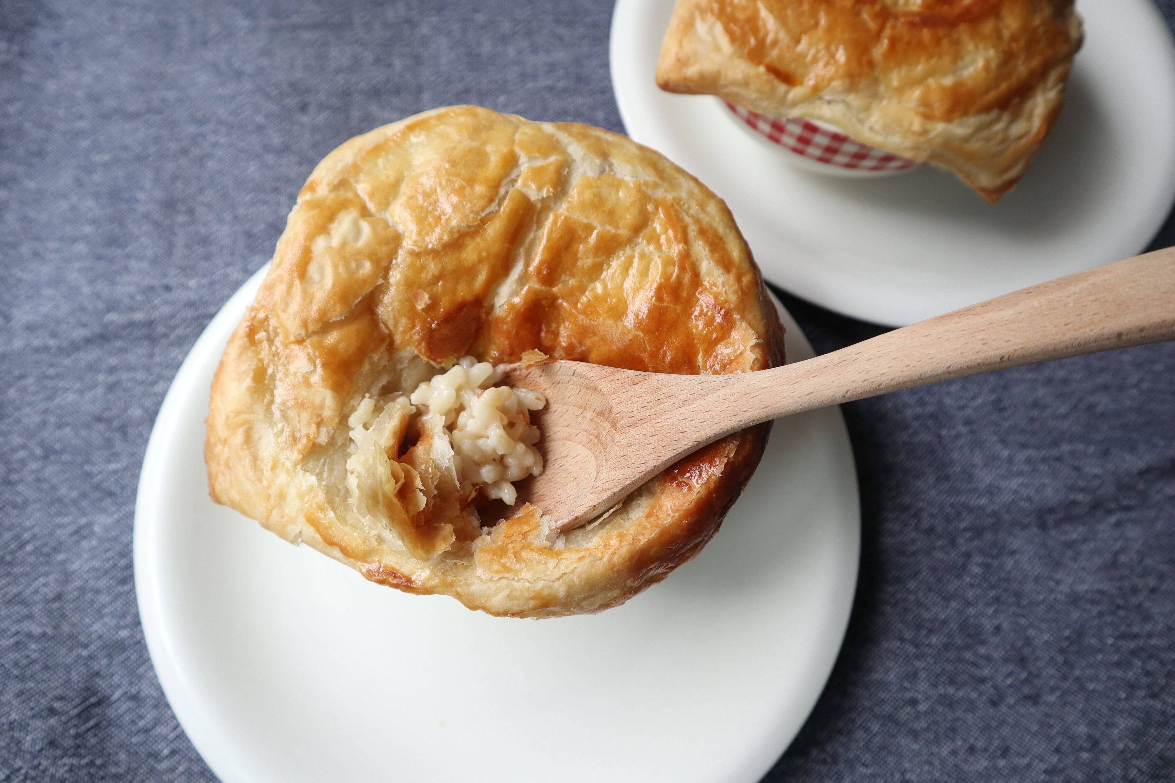 耐熱のボウルに、リゾットを入れて冷凍パイシートをかぶせて、溶き卵をぬって、200度のオーブンで15分焼きます。