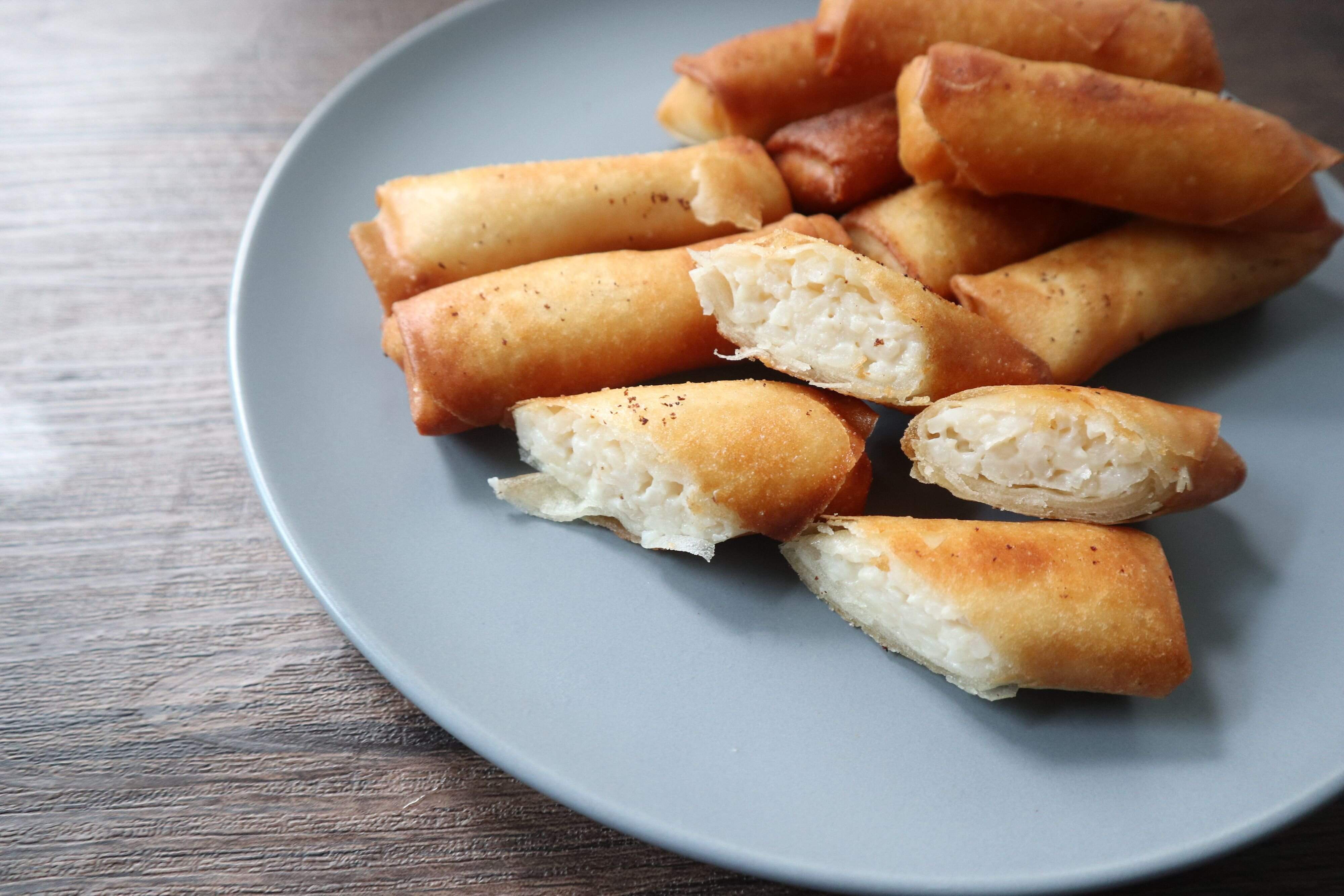 春巻きの皮で包んで180度の油でこんがりキツネ色になるまで揚げます。