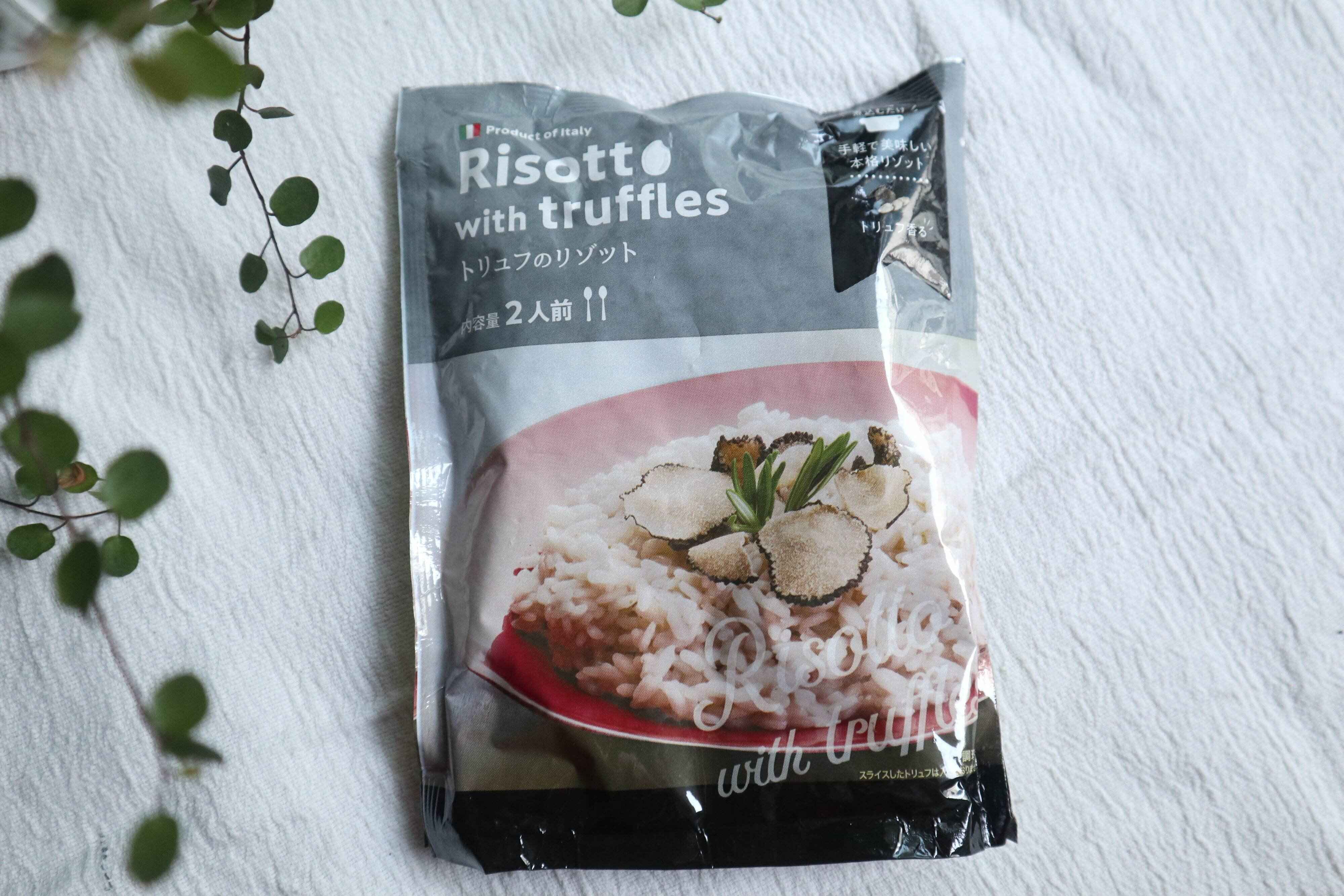 同じシリーズの「トリュフのリゾット」は175gで2人前、248円。トリュフだからチーズリゾットよりも30円ほど高いですが、個人的には「トリュフなのに30円しか変わらないのかぁ」と驚き。こちらもつくり方はチーズリゾットと同じです。