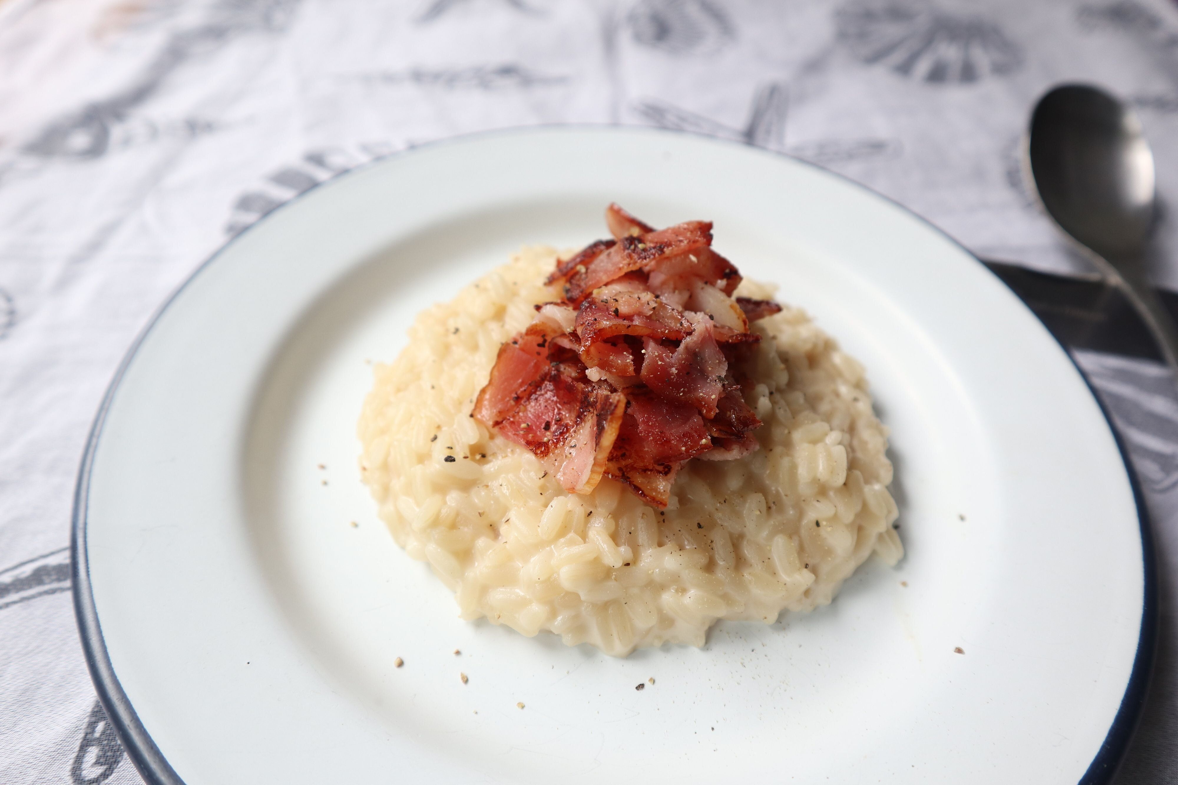 お好みでベーコンをのせたら完成です!濃厚でクリーミーなイタリアンチーズリゾットが1人前109円で食べられるなんて感動です!