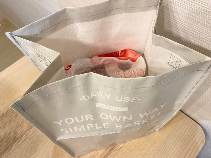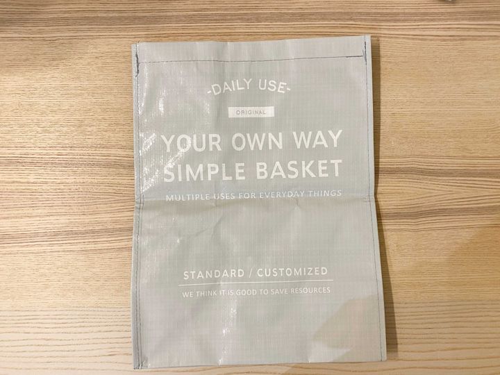 なお、写真の商品はグレーに白文字と、白に黒文字の2種類が販売されており、サイズはMとLの展開。筆者はグレーのLサイズ(44×40×25cm)を購入しました。価格は100円です。