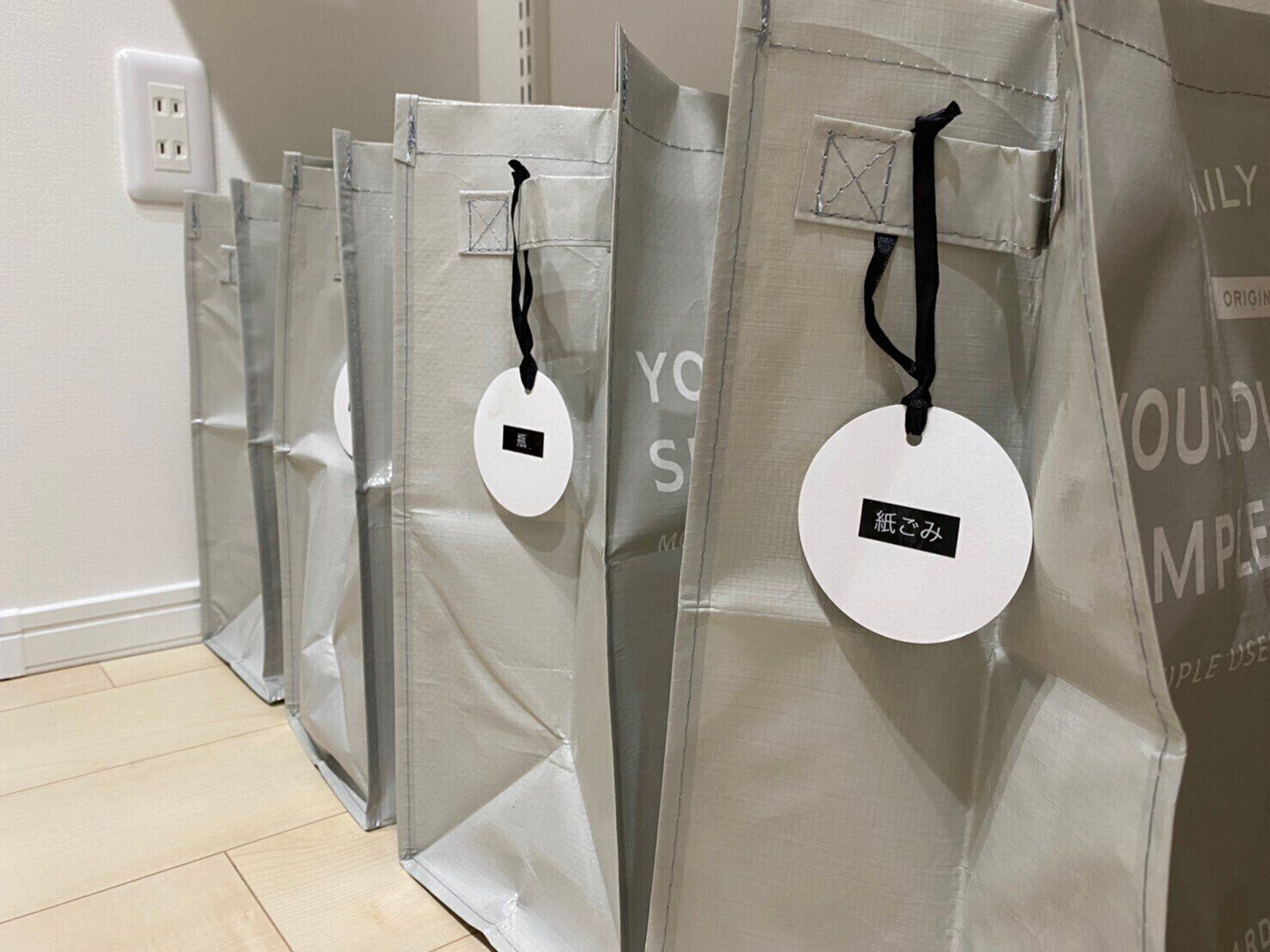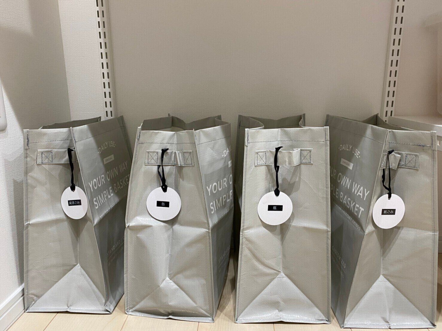 両サイドに取っ手がついているので、そこにタグをつけてみました。そして中にビニール袋をセットすれば、種類別に分けて捨てられる、分別ゴミ箱の代わりになります。