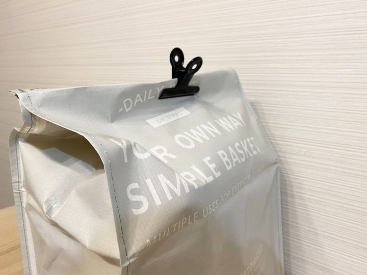 また、どうしても中身を見せたくないときには、クリップを使って入り口部分を閉じてしまうのもおすすめ。写真のクリップはセリアの文房具売り場で2個セット100円で購入したものです。