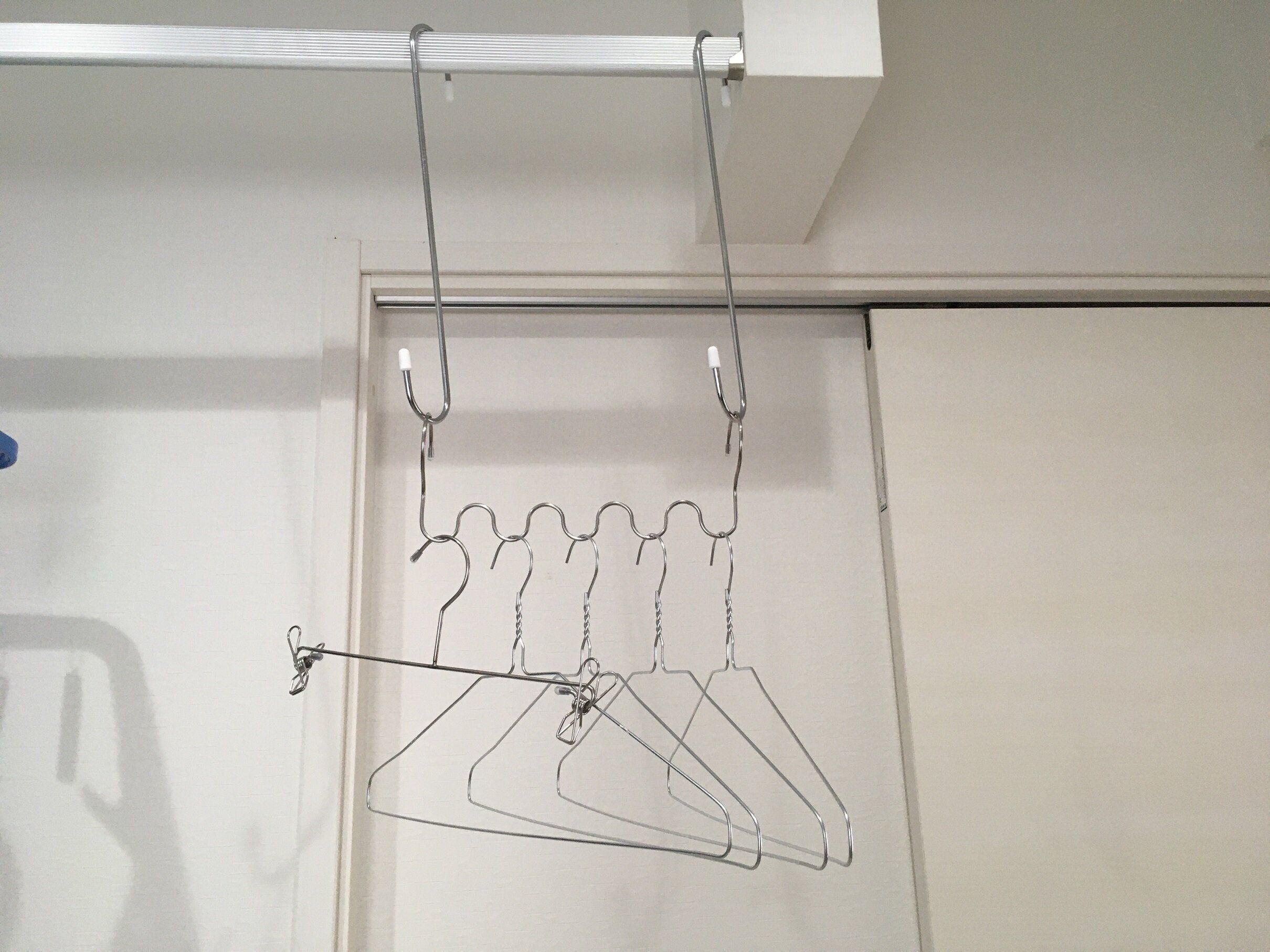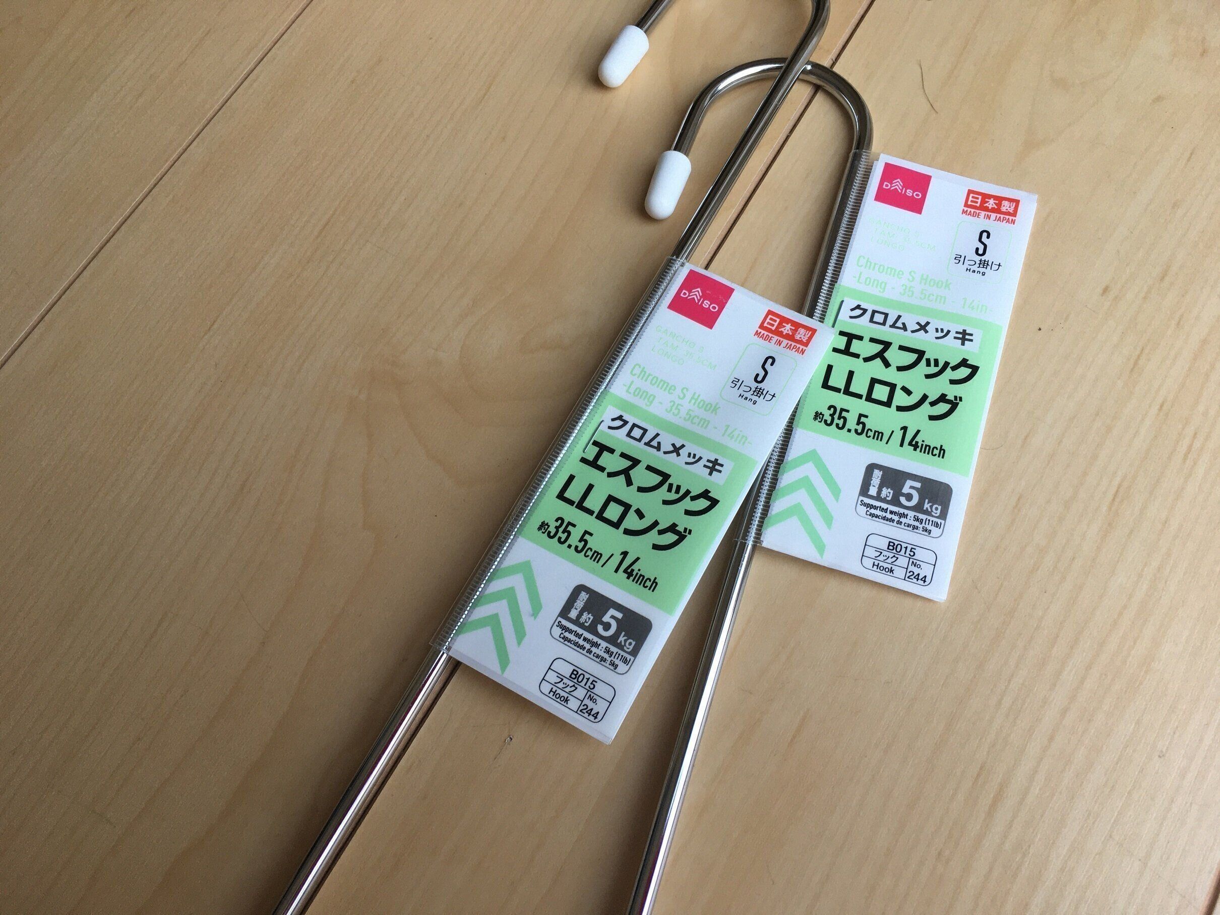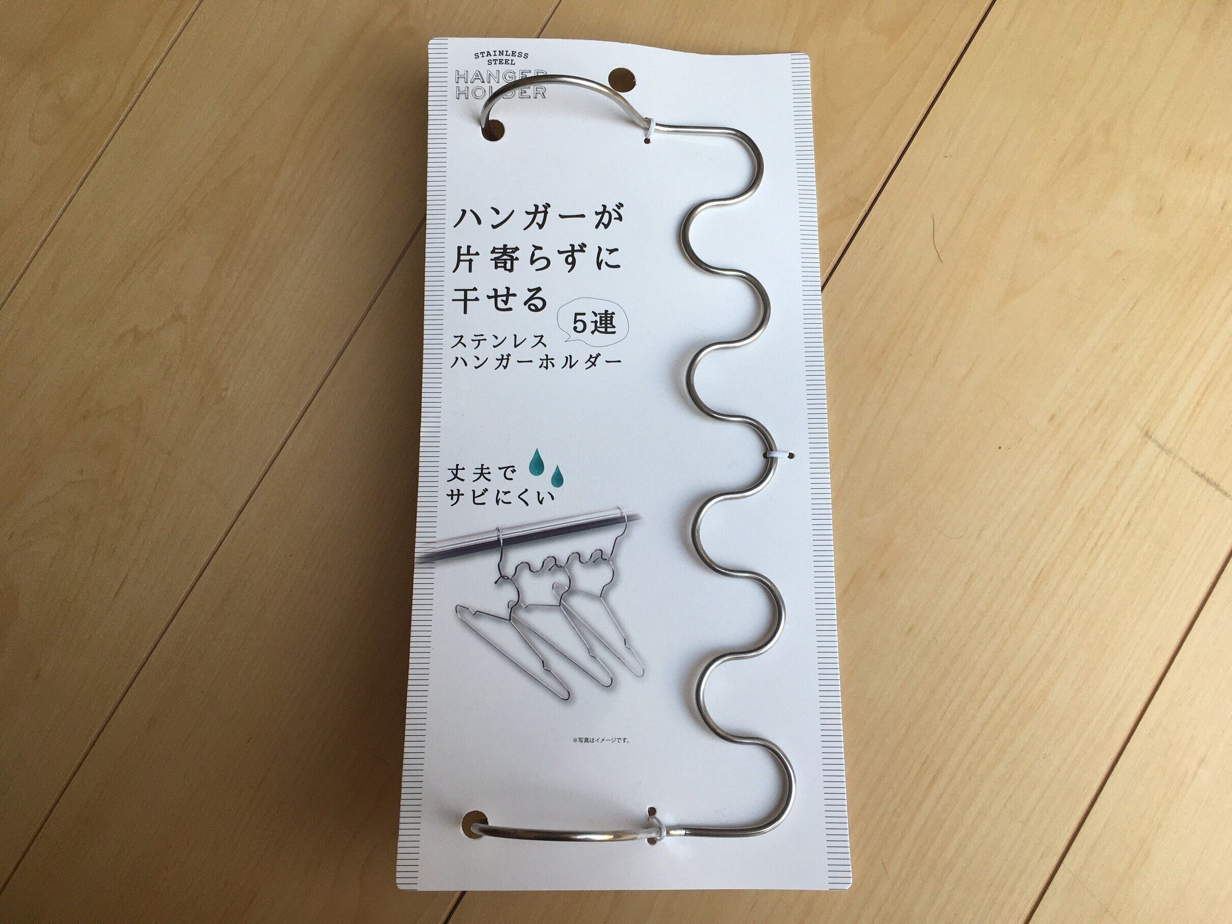今回使うアイテムは、セリアの「ハンガーが寄らずに干せるステンレス5連ハンガーホルダー」。同ショップでは以前から人気の定番アイテムですが、ポイントはこの商品にダイソーの「エスフックLLロング」を組み合わせるところ。