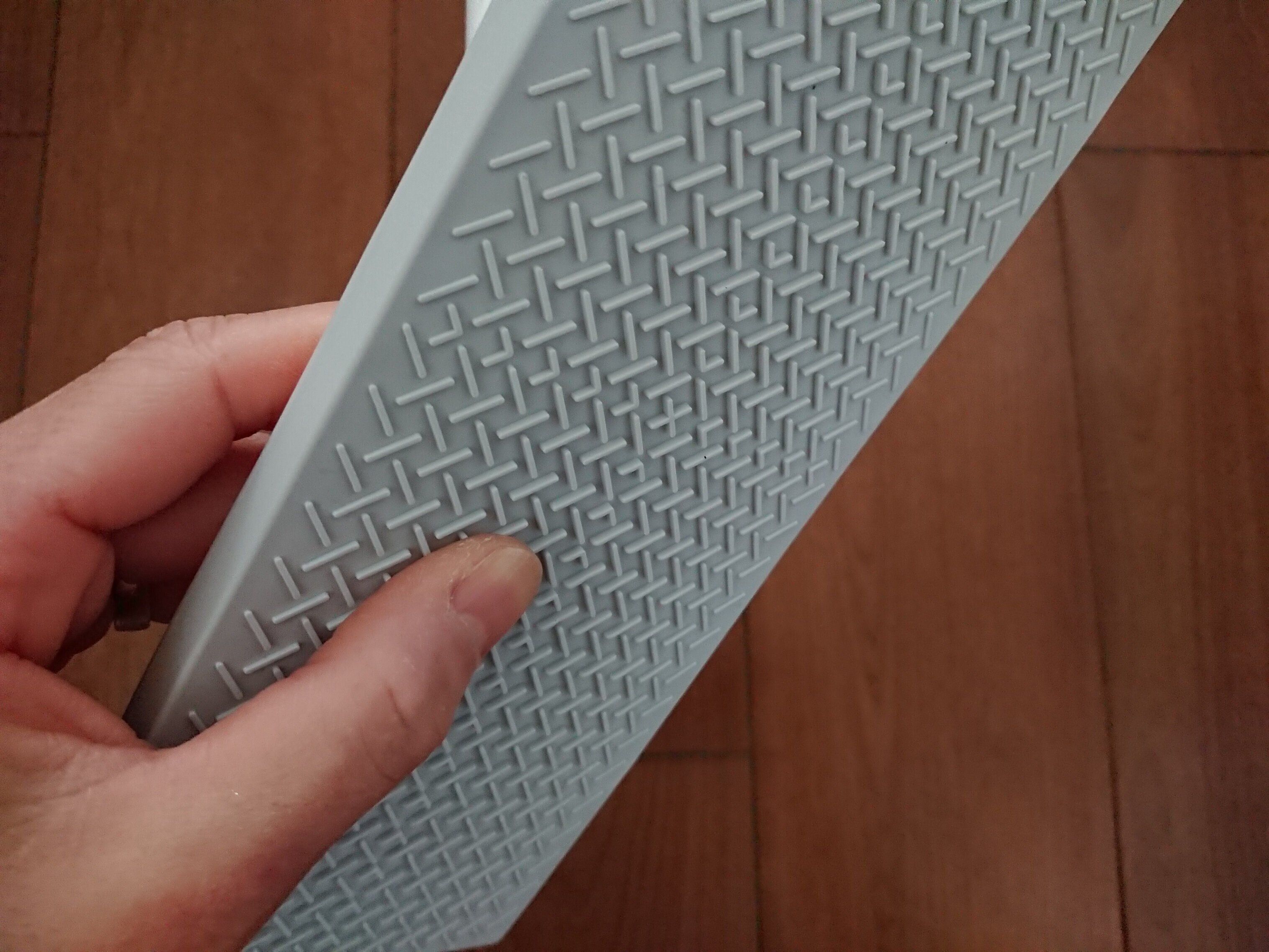 指で押すと少しだけ凹むくらいの弾力で、柔らかすぎず、硬すぎずといった感じ。説明にも書いてありますが、中央の凸型構造とこの柔らかいクッション素材の組み合わせで、上から力が加わったときにしっかりと床になじむ感じがします。