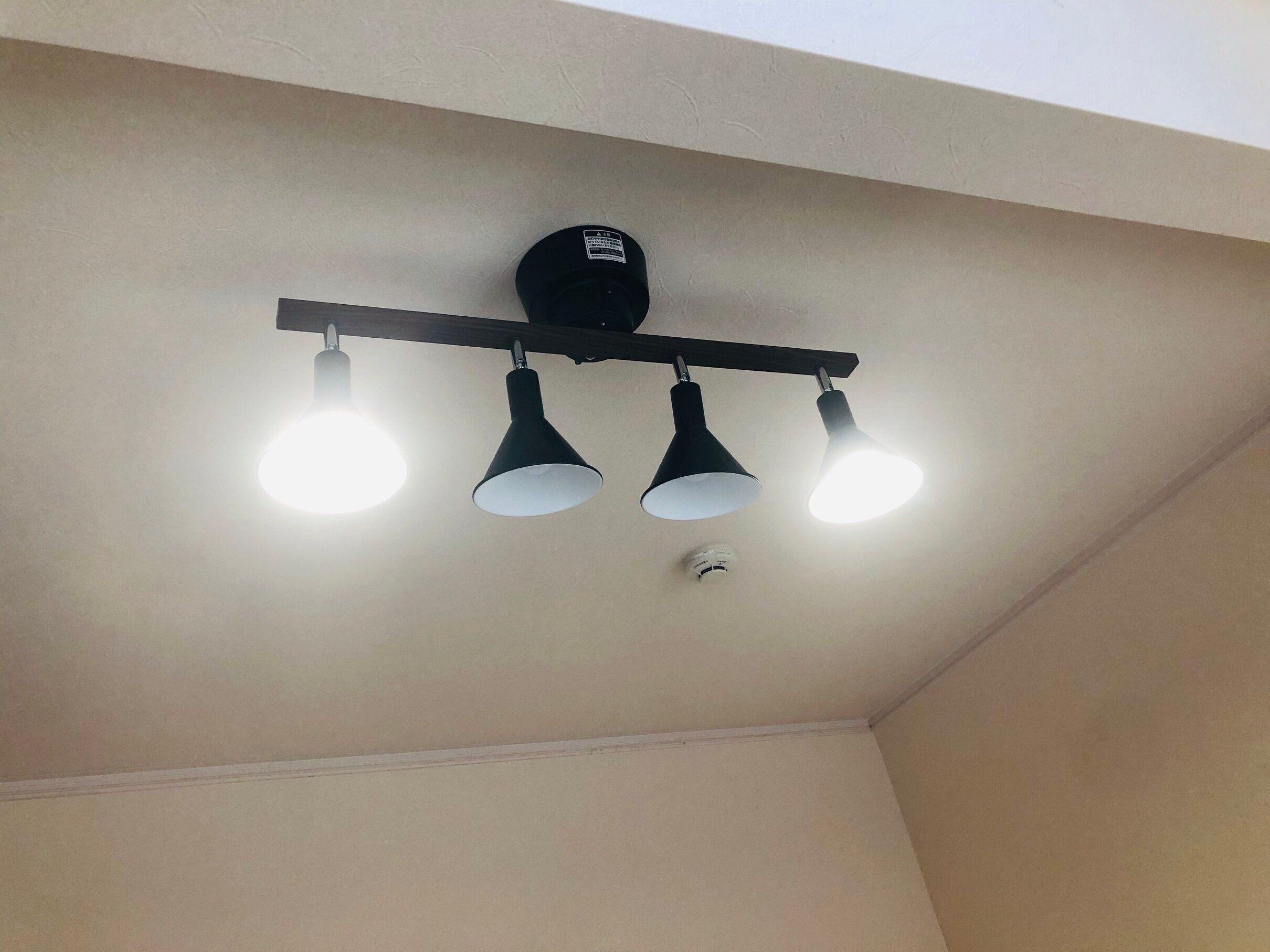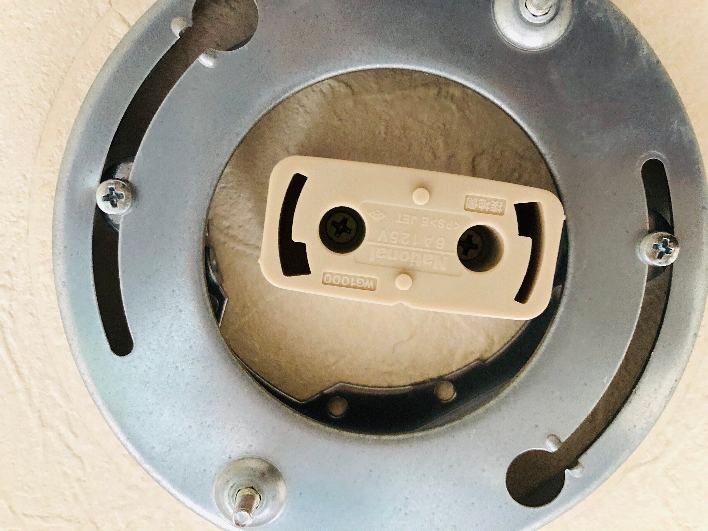 ライトを外すと、シーリング(照明器具接続ソケット)がついています。上の写真は「角型引掛シーリング」ですが、それ以外でも「引掛埋込ローゼット」、「丸型フル引掛シーリング」などのソケットにも今回の商品は対応しているので、詳しくは購入前に確認するようにしてください。なお、もし対応するソケットがついていない場合は、取りつけができるように電気工事が必要になります。