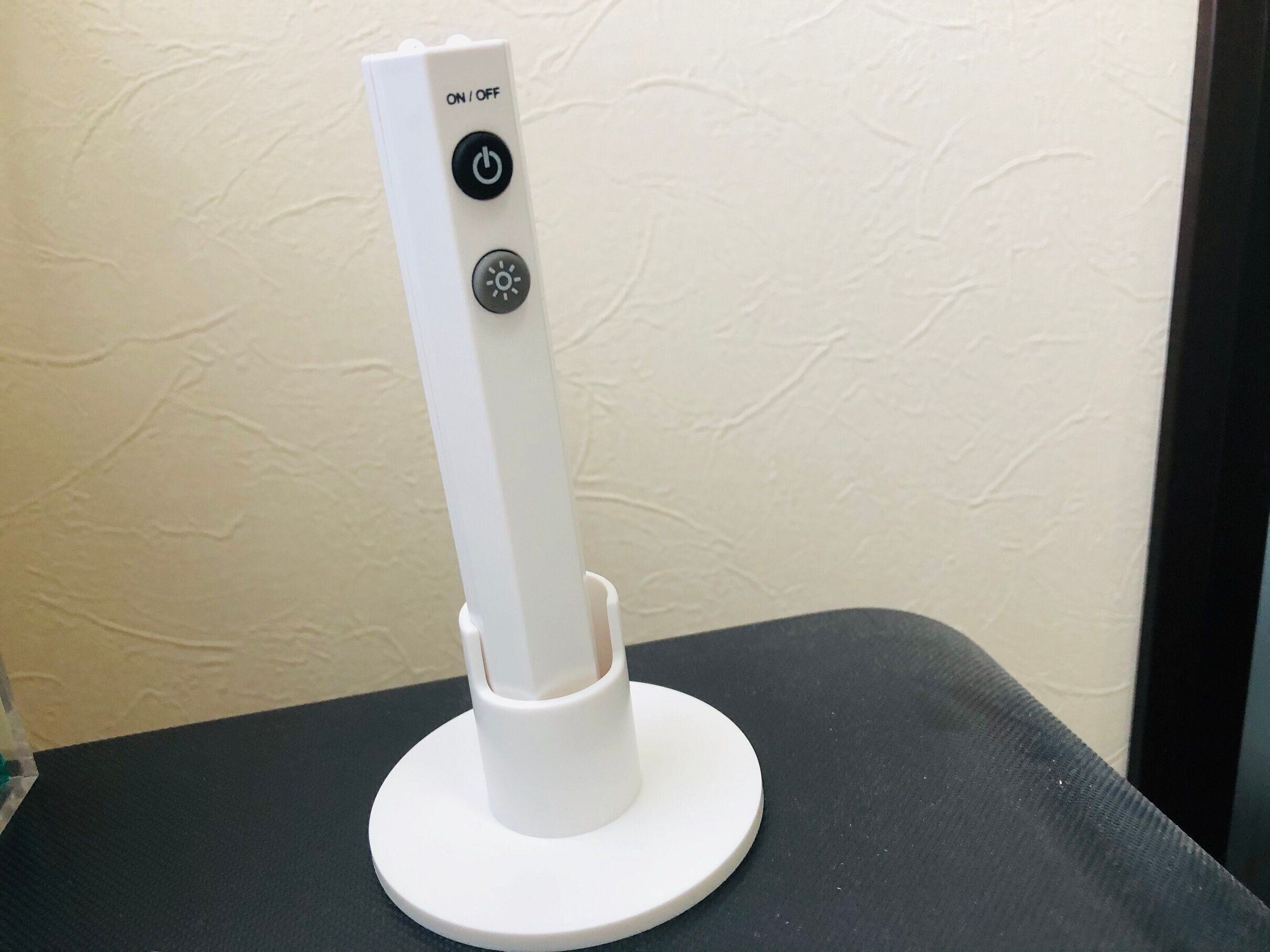 リモコンはスティック状のシンプルなデザイン。スタンドもついているから、置き場所にも困りませんね。