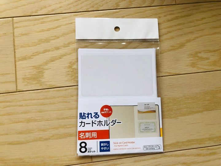 靴箱の効率的な管理に使えるダイソーアイテムをご紹介します。今回使うのは「貼れるカードホルダー」。名刺サイズのホルダーが8枚入って、価格は100円!粘着シールがついているのであちこち貼ることができちゃいます。