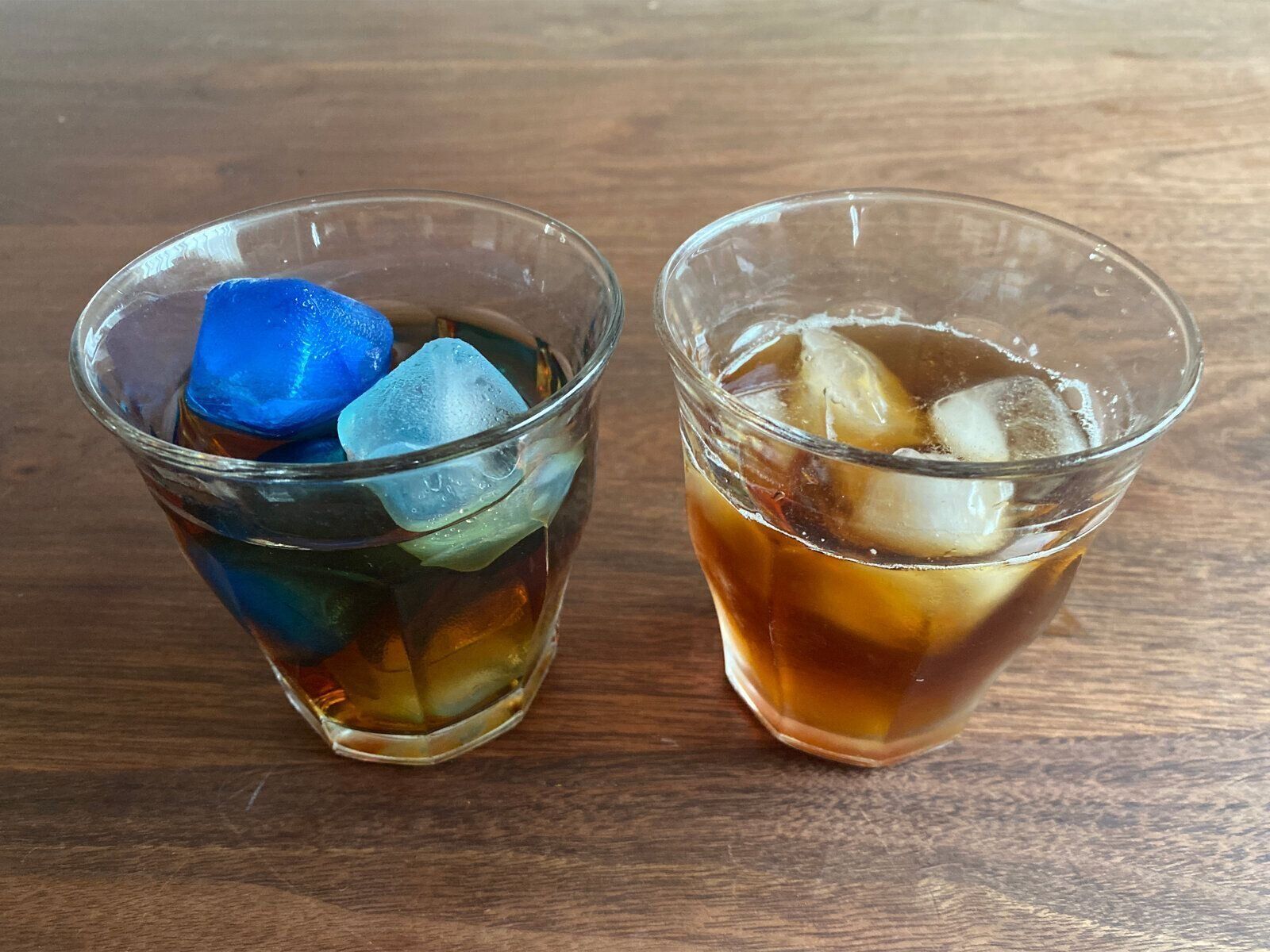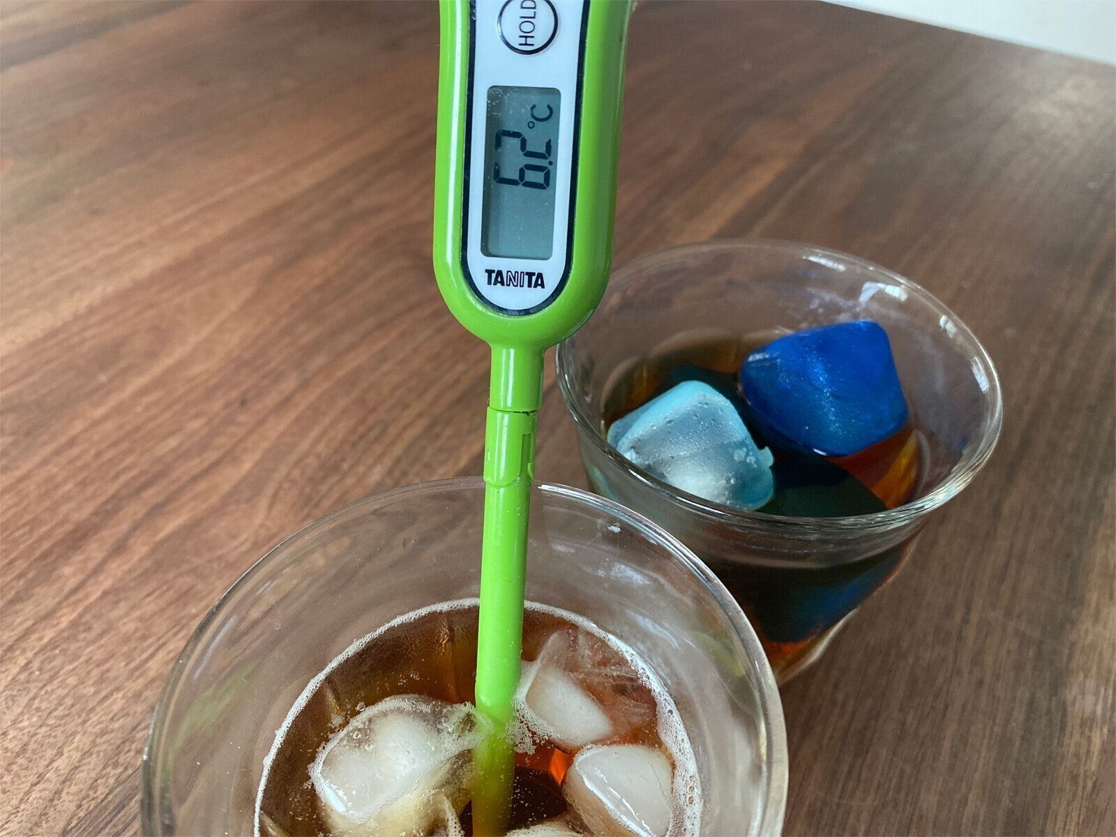 ちなみに、氷との違いを確認するため、同じ量のお茶にほぼ同じ大きさの氷とアイスキューブを入れて置いてみました。直後に氷を入れたお茶の温度を測ると6.2℃、一方アイスキューブは7.8℃と、急速に冷やすのは氷に軍配があがりました。