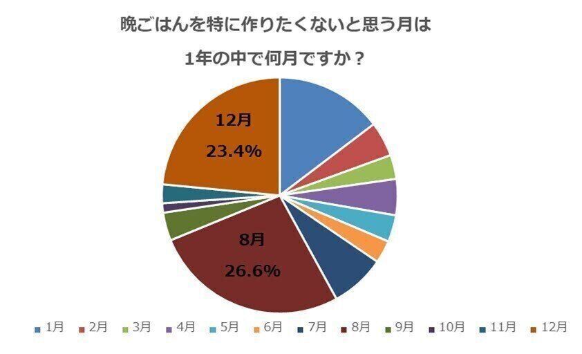 晩ご飯をつくりたくないと思う月は1年の中で何月か?3つまで回答してもらった結果、いちばん多かったのは「8月」の26.6%。次に多かったのは「12月」の23.4%でした。