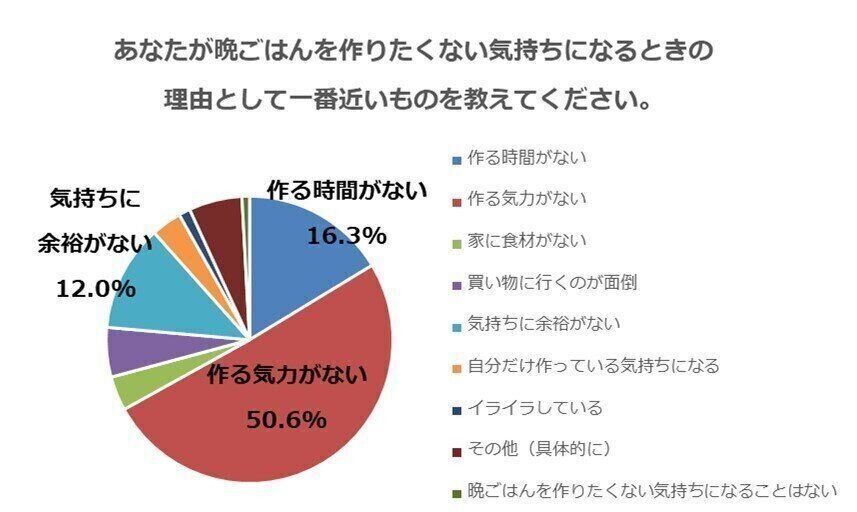 「あなたが晩ご飯をつくりたくない気持ちになるときの理由としていちばん近いものを教えてください」の質問に、いちばん多かったのは「作る気力がない」の50.6%。次はぐっと減って「つくる時間がない」の16.3%、「気持ちに余裕がない」の12.0%が続きました。