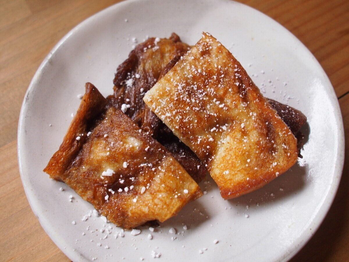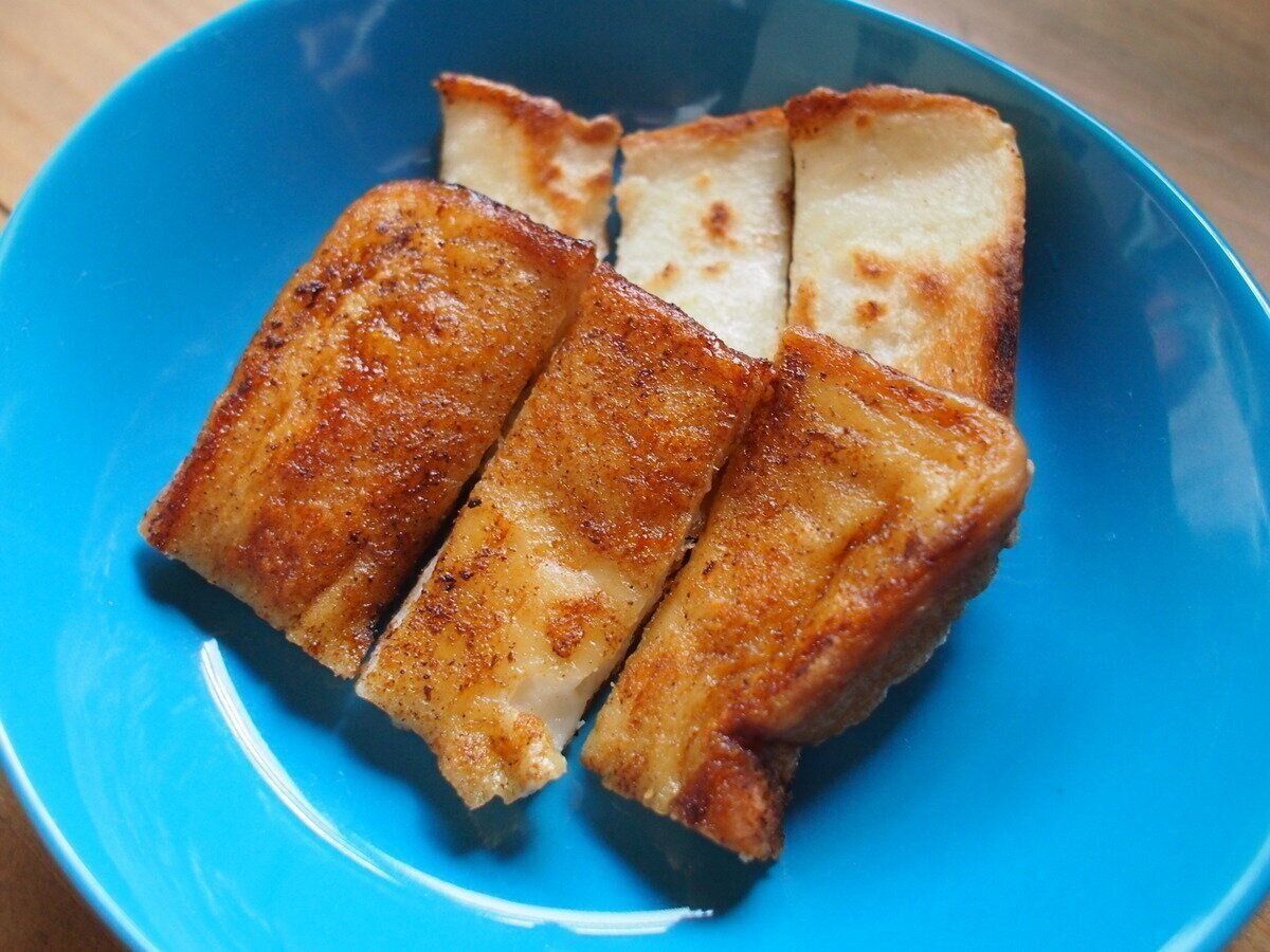 このアレンジを教えてくれたのは、知り合いの喫茶店のマスター。いわく「食パンでもフランスパンでもOKだし、牛乳をベースに紅茶やココアなどいろいろなものにパンを浸して、フライパンで焼いてみてください。砂糖は甘いなと思うくらい多めに入れるほうがおいしくなりますよ」とのことでした。