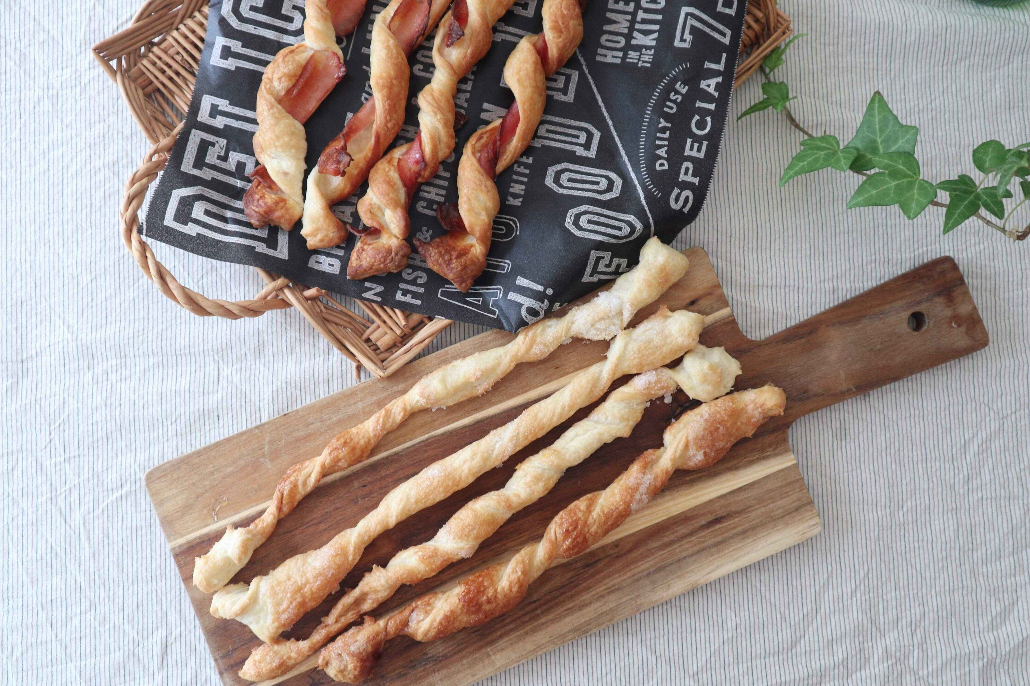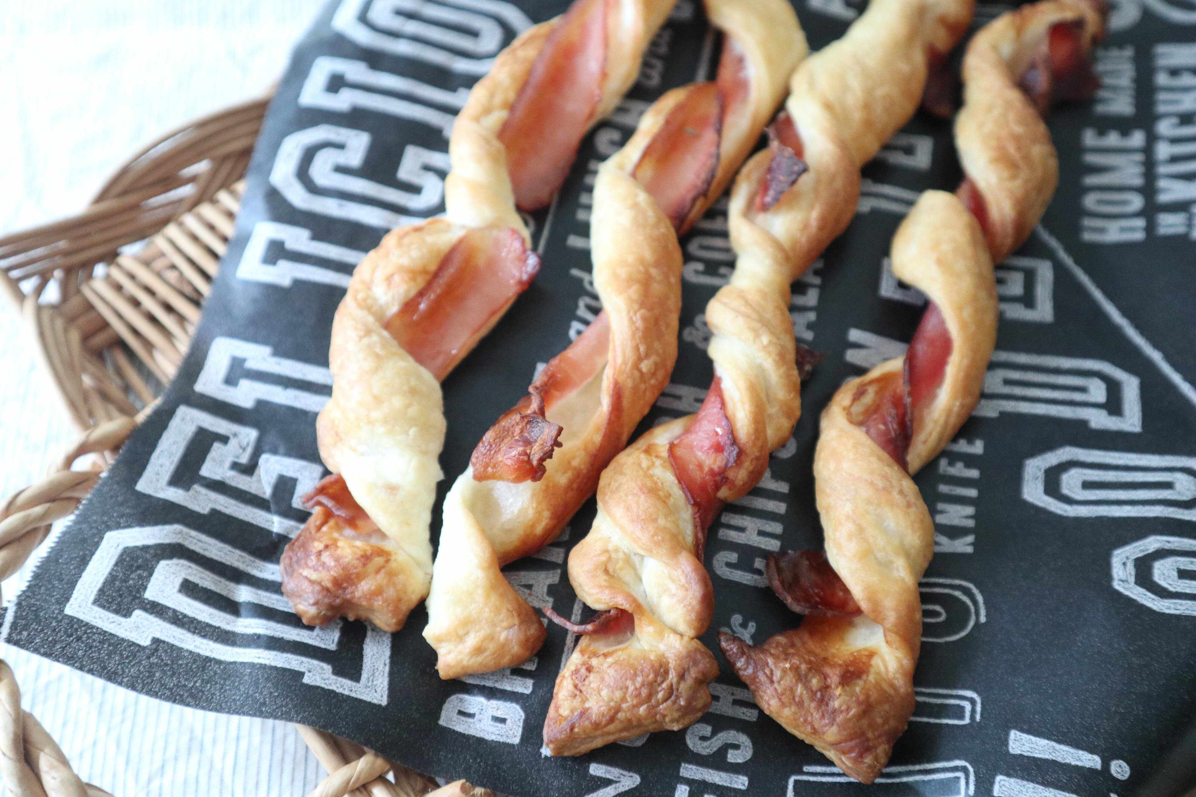 ねじりベーコンパイは、親子クッキングにぴったり!冷凍パイシートを縦4等分に切り、5分ほど自然解凍させたものに、ベーコンをのせてねじっていきます。200度のオーブンで13分焼いたら完成です。辛みが大丈夫な場合は、粒マスタードをパイシートにぬるのもおすすめです。