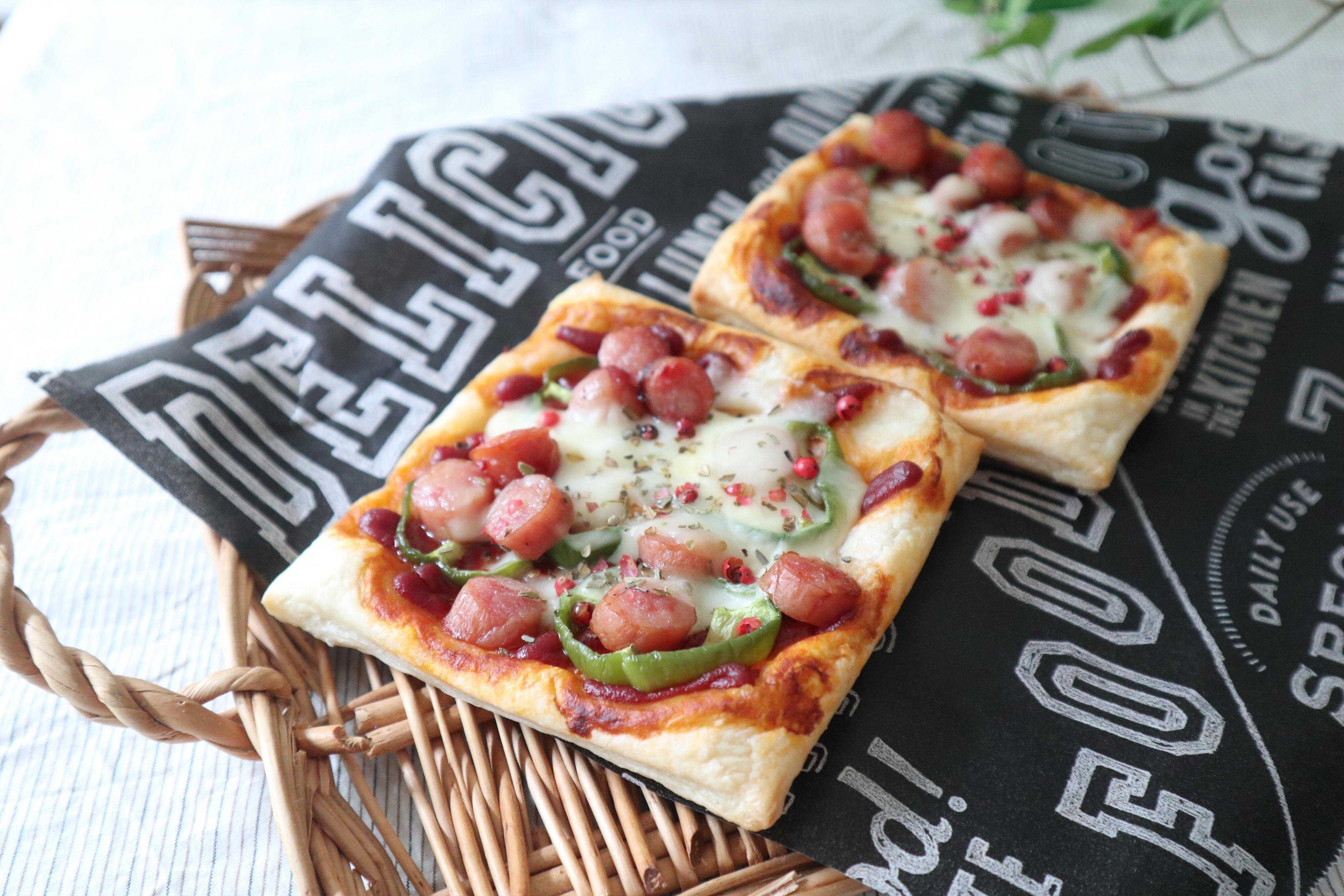 朝食にもおすすめなのが、ピザパイです。つくり方はとても簡単。パイシートを横半分に切り、それぞれにケチャップを塗って、具材(写真は、ピーマン、ウィンナー、オレガノ、ピンクペッパー)とチーズをのせて、200度のオーブンで15分焼けば完成です。歯切れのいい軽い食感のパイシートでつくることで、朝からピザでもサクサクと食べられますよ。